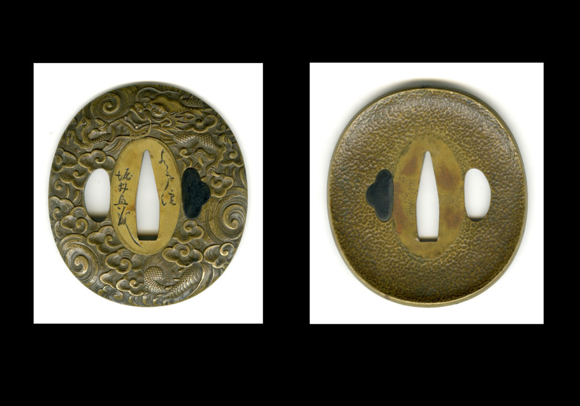 This is a well carved tsuba by Mito Ju Horii Okinari. This tsuba measures 2.75 inches or 7.0 cm by 2.5 inches or 6.4 cm. It is made of brass and is cupped to resemble the guard of a European rapier. This shape became very popular during the Edo period. The reverse of the tsuba is well stippled by hammering and the obverse is superbly carved into a dragon frolicking among the clouds. The carving is really fine and wonderfully detailed.