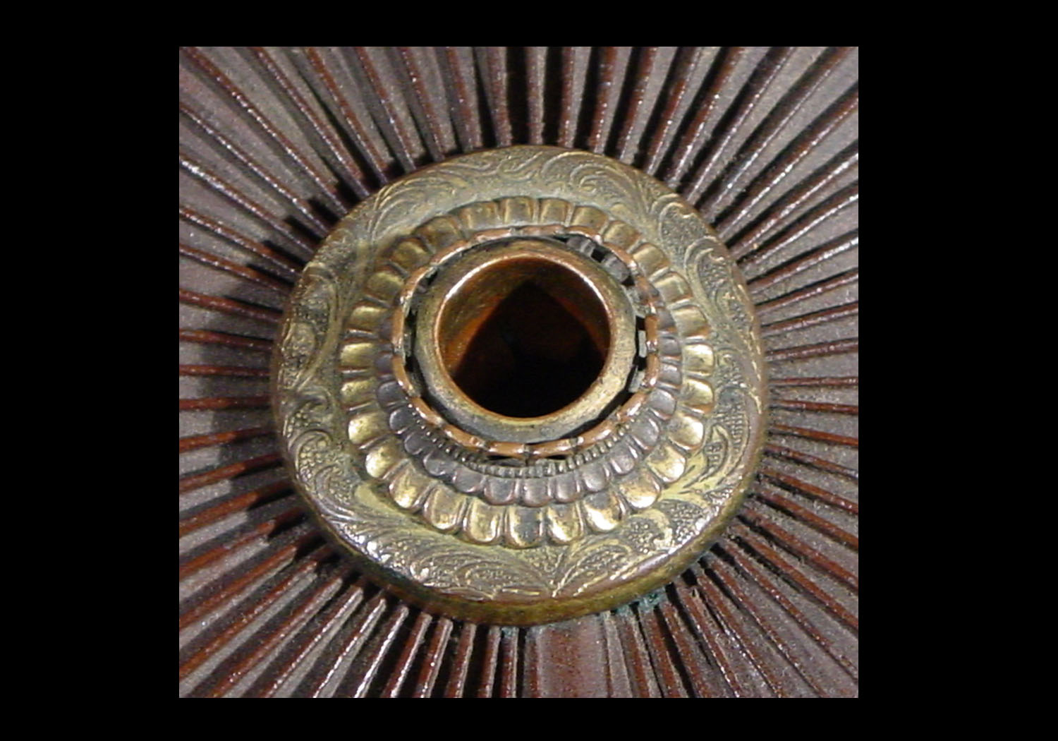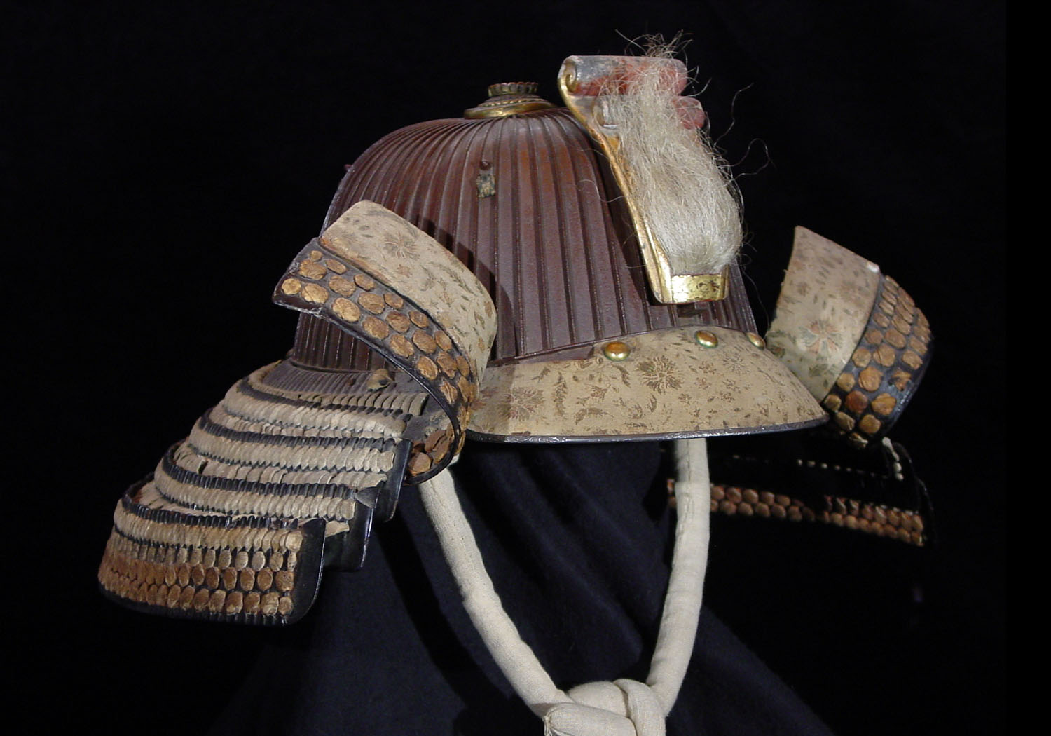 The iron bowl has a brownish tinge from age and the bowl is in excellent condition. The teihen kanamono is comprised of six layers of brass done in a scalloped pattern with the bottom layer delicately carved in a floral pattern. Attached by three large brass rivets to the front of the bowl is a mabisashi that has been covered with doe skin and rimmed with a narrow silver band that has been delicately carved. The bowl has a four lame shikoro that has been laced with doe skin and finished with a brown ito. The top lame turns back into large fukigaeshi that have also been partially covered with doe skin to match the mabisashi. The shikoro looks to be from the middle Edo era and it has held up wonderfully well because the lacing is doe skin instead of ito. The helmet also has an interesting Edo period maedate of what looks to be paper scrolls with a horse hair decoration It is made of wood and lacquered.