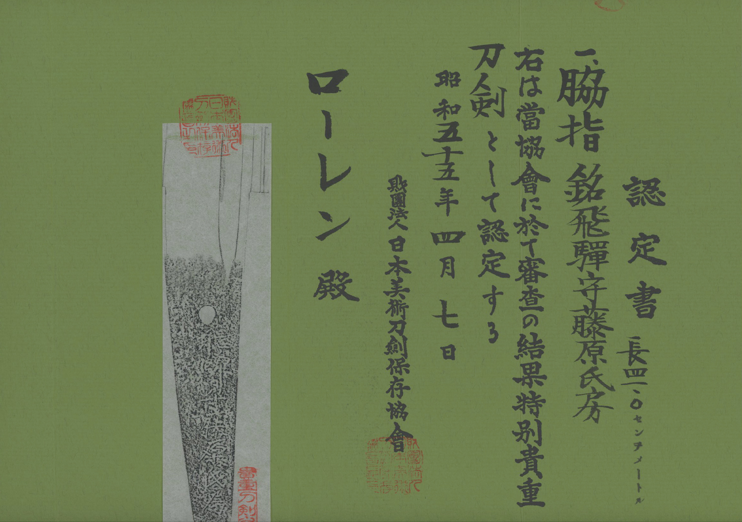 Both of these swords come with NBTHK certifications. These certifications were issued by the NBTHK when they held one of the only two shinsa ever held in the United States. This shinsa took place in Dallas in 1980. They were very strict on their judgements because these shinsa were on foreign soil away from the home office in Tokyo where their vast library of data is stored. I have no doubt that these swords would be awarded at least Hozon Token certifications if they were resubmitted today.