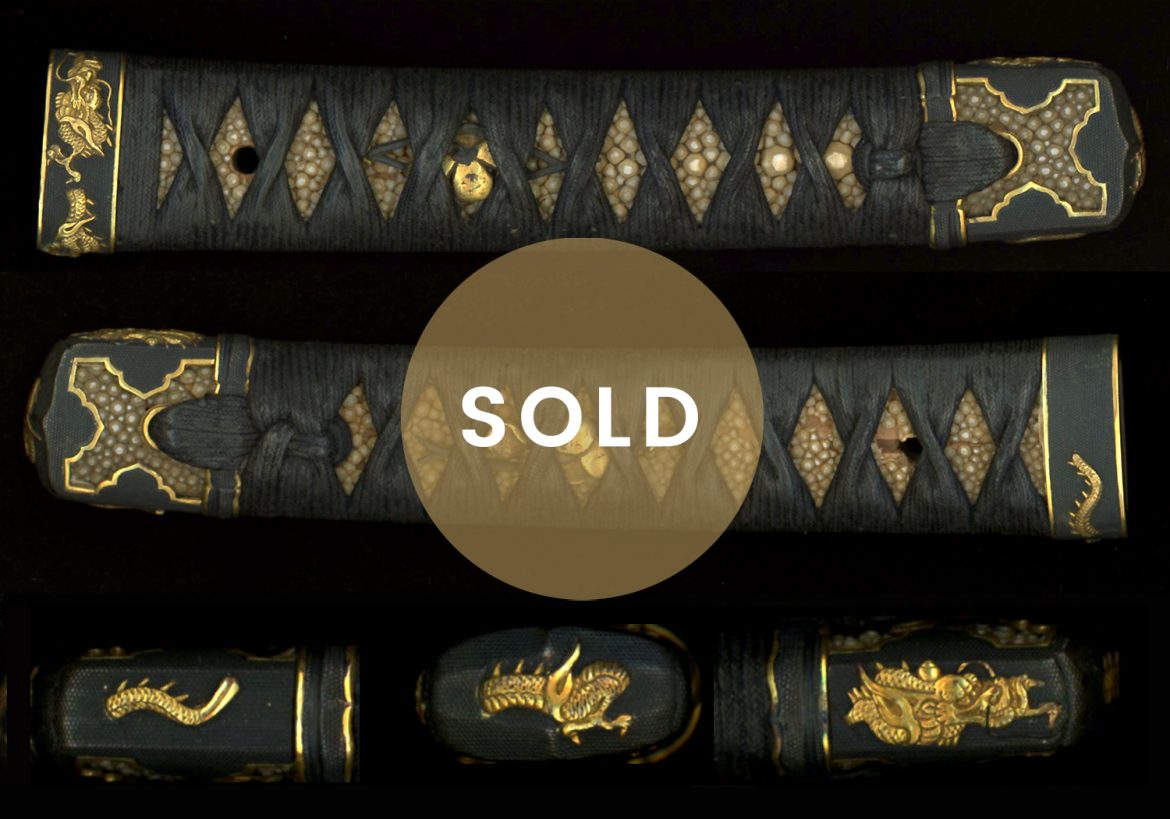 This is a very nice tsuka for a handachi wakizashi. The total length is 7.5 inches or 19.1 cm. The mekugi ana is 1 3/8 inches or 3.5 cm from the edge of the fuchi. The fuchi and kashira are of dark shakudo of high quality and are emblazoned with golden dragons carved in very high relief. Very striking, indeed. The menuki are made of shakudo and gold with one being a persimmon and the other a flower blossom. The ito is dark black and in excellent condition with no fraying. The same is of good grade and shows good age. There is only one small area of loss to the same at the mekugi ana, but this is to be expected with age and use and can be repaired. Overall, this is a very high grade tsuka with great kodogu.