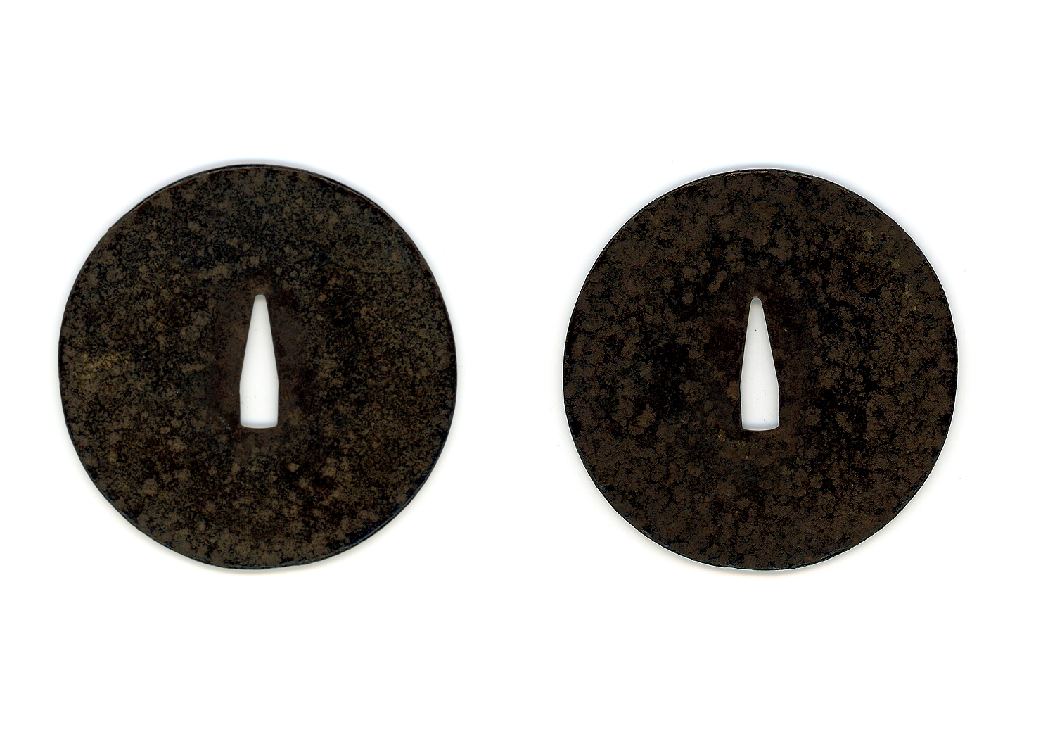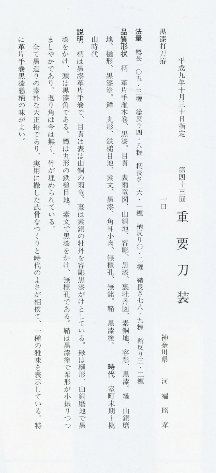 Form of the Component Parts: The tsuka is wrapped in leather katake-gangi style (solid wrapping with raised striations) and lacquered black. The omote menuki is carved in the shape of a rain dragon with a yamagane (yamadô) ground and lacquered black, and the ura menuki is carved in the shape of a peony with a suaka ground and lacquered black. The fuchi has a polished yamagane ground, a higata (grooved) shape and is lacquered black. The tsuba is round with a hammered iron ground and lacking any decorations. It is black lacquered and has a squared rim with slight rounding (kaku-mimi ko-niku) and is without hitsu-ana. It is unsigned. The saya is black lacquered.