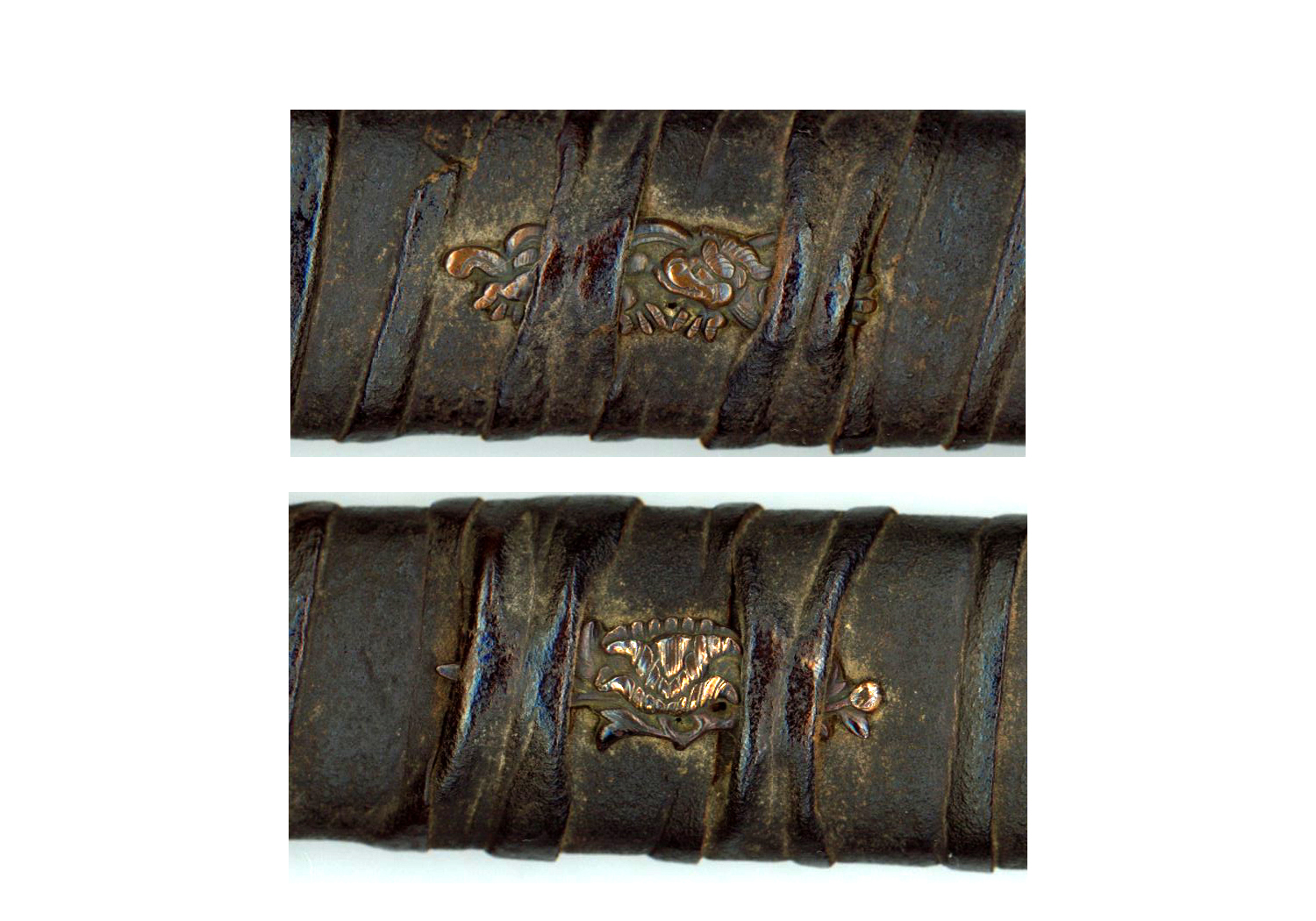 Description: The tsuka is solidly wrapped in black lacquered leather. The omote menuki is a yamagane rain dragon, and the ura menuki is a suaka peony. Both are carved to shape and lacquered black. The fuchi has a grooved shape with a polished yamagane ground that is lacquered black. The kashira is black lacquered horn. The tsuba is round with a hammered surface that is without decoration and black lacquered. There are no hitsu-ana. The saya is black lacquered and the kurikata is small sized and modestly proportioned. The kaeritsuno is now missing and the opening is fill with a piece of bamboo.