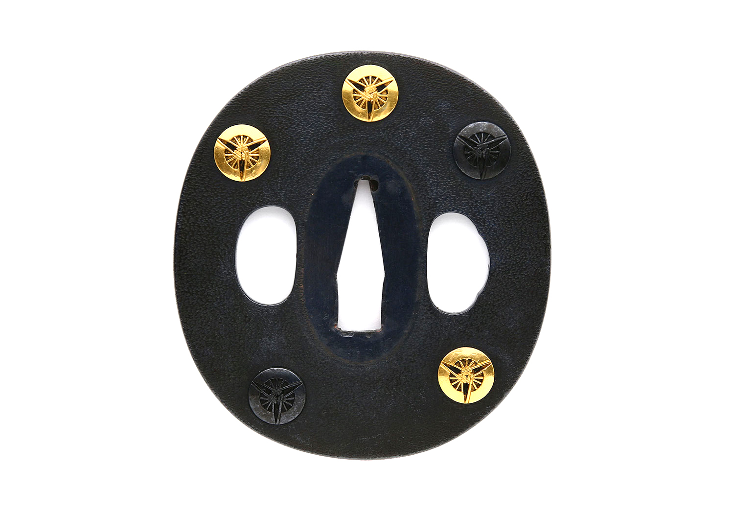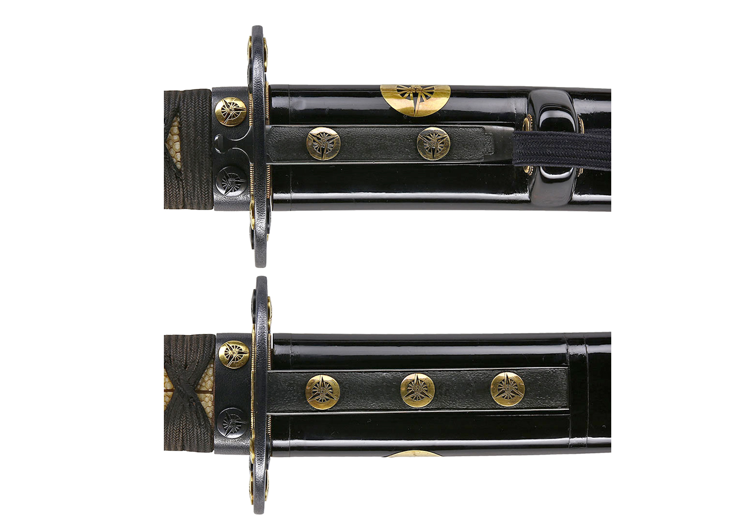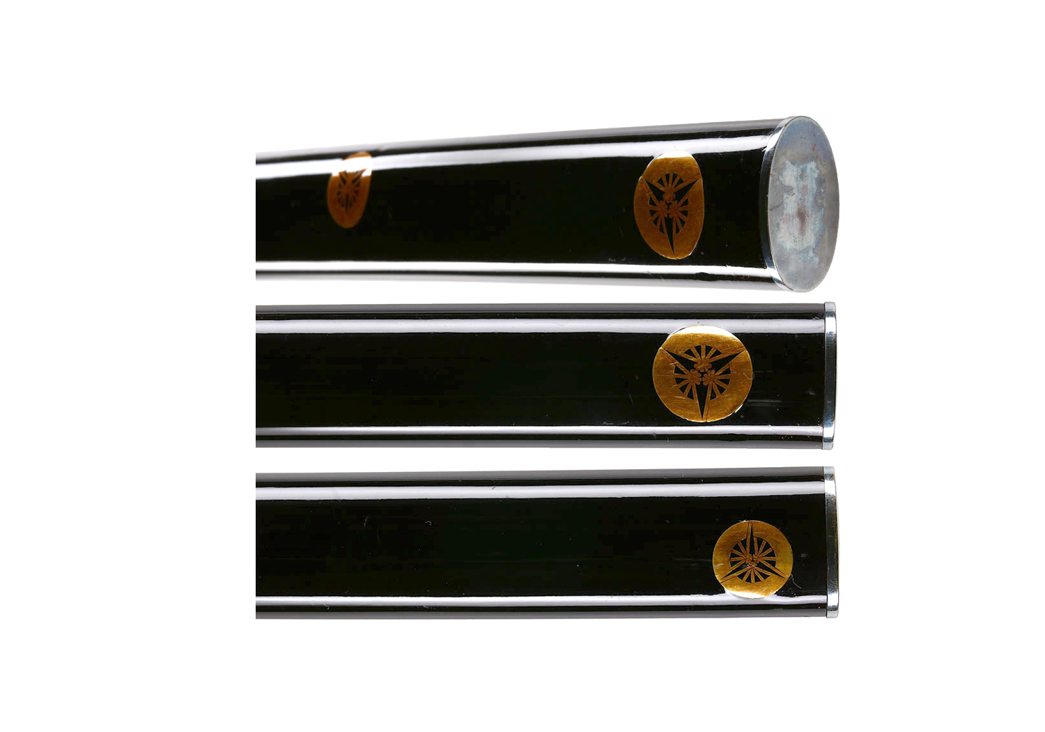 Kuro roiro-nuri mitsu-ōgi-mon kanagai saya Satsuma-daishō-koshirae (⿊蠟⾊三ツ扇紋⾦⾙鞘薩摩⼤⼩拵) – Satsuma-daishō-koshirae featuring glossy black lacquer saya with gold nacre décor of three-fans crests daishō-tsuba and fuchi, mei: Tenpō jū tsuchinoto-i jūnigatsu hi – Samejima Munenori kore o horu (天保⼗⼰亥⼗⼆⽉⽇・鮫島宗徳彫之) – “Carved by Samejima Munenori on a day in the twelfth month of Tenpō ten (1839), year of the boar”