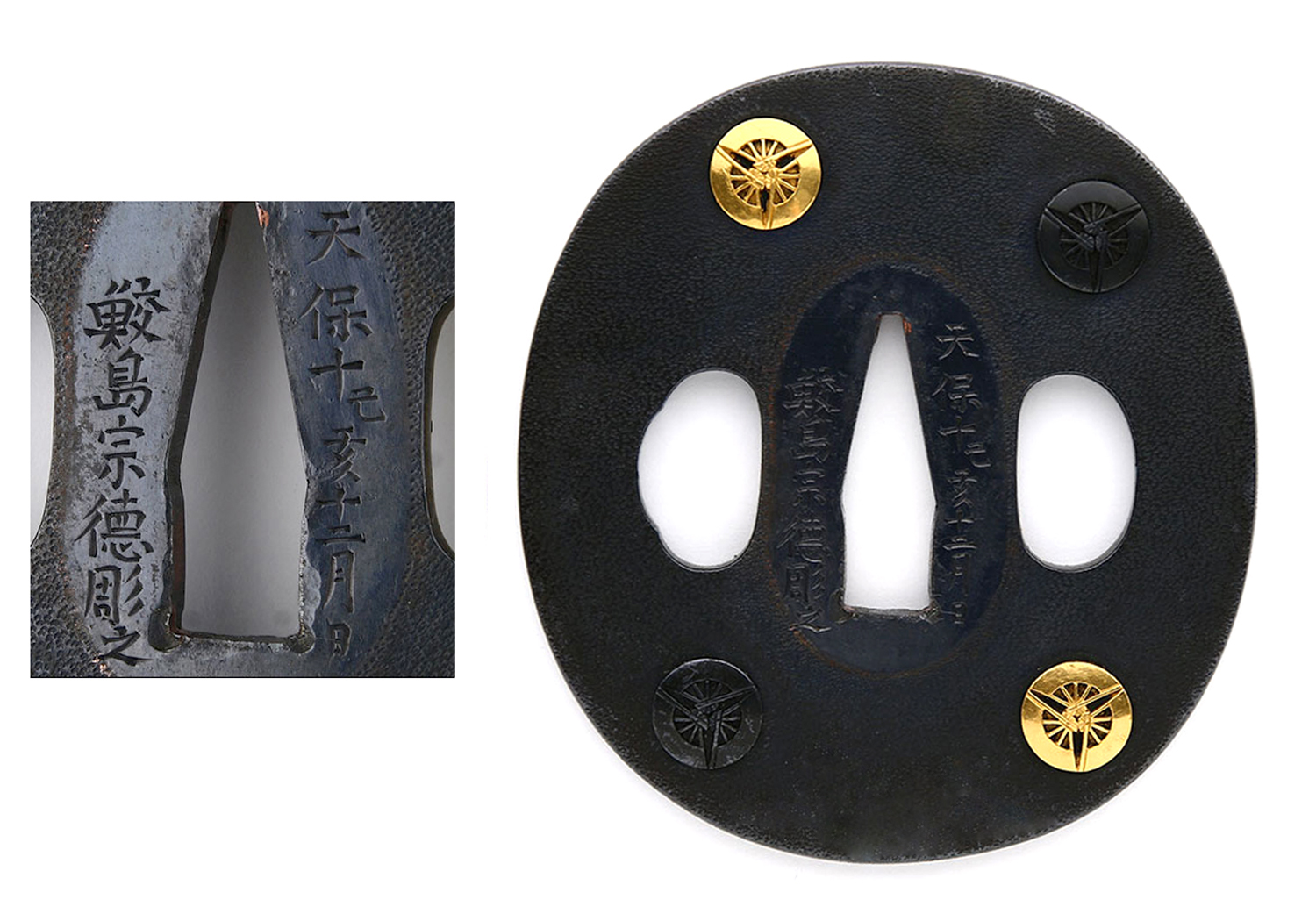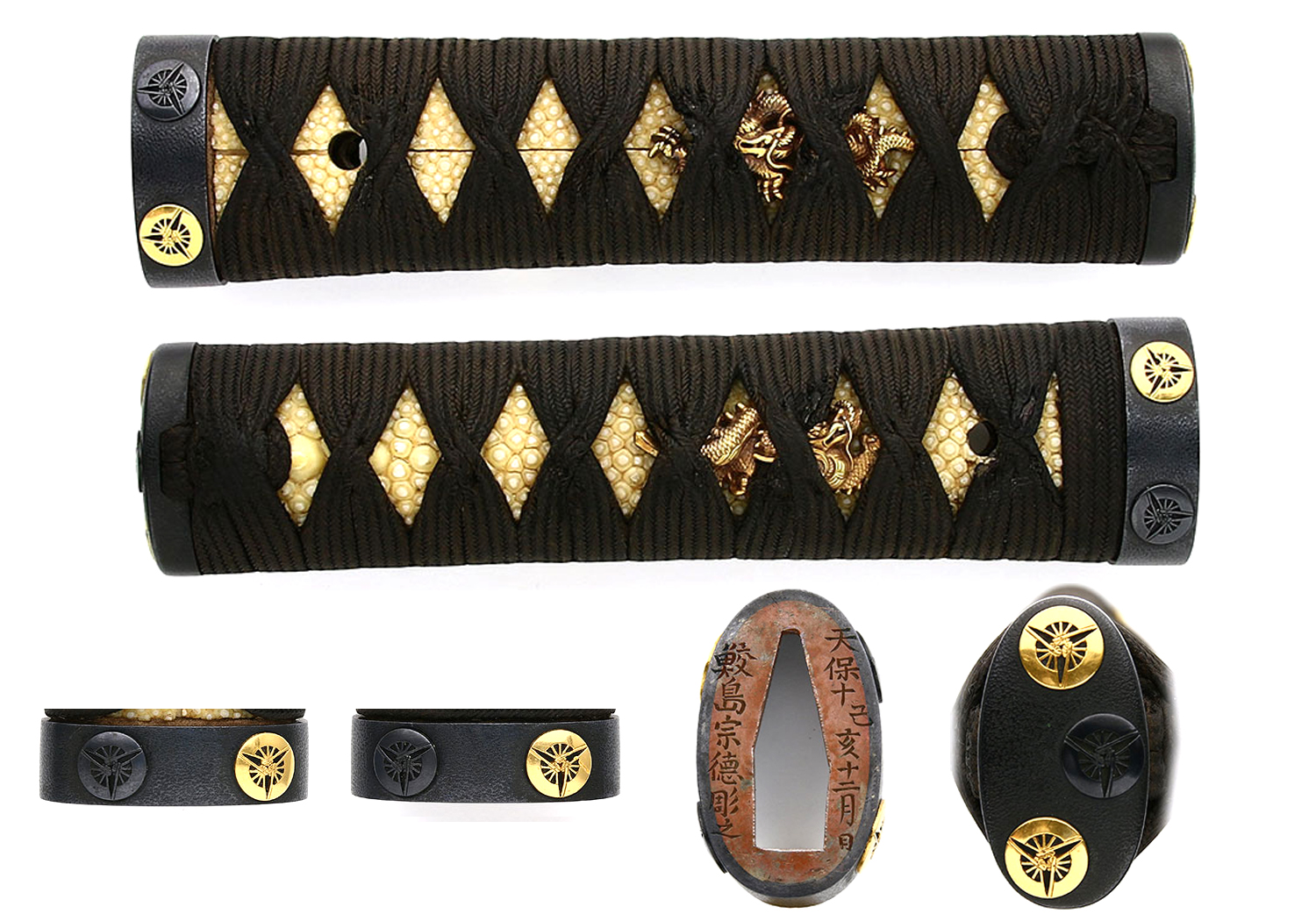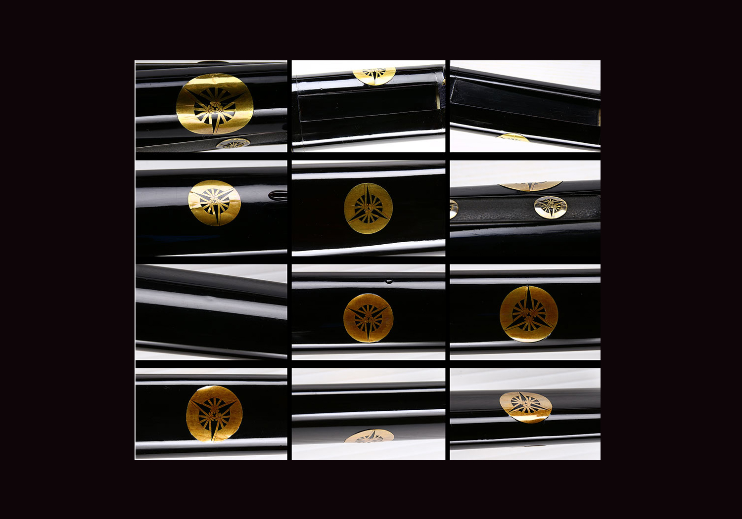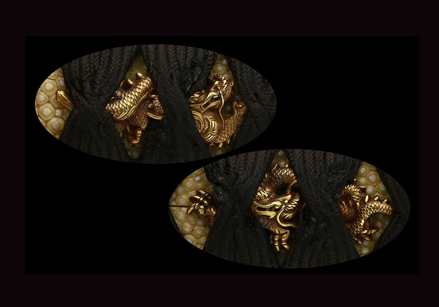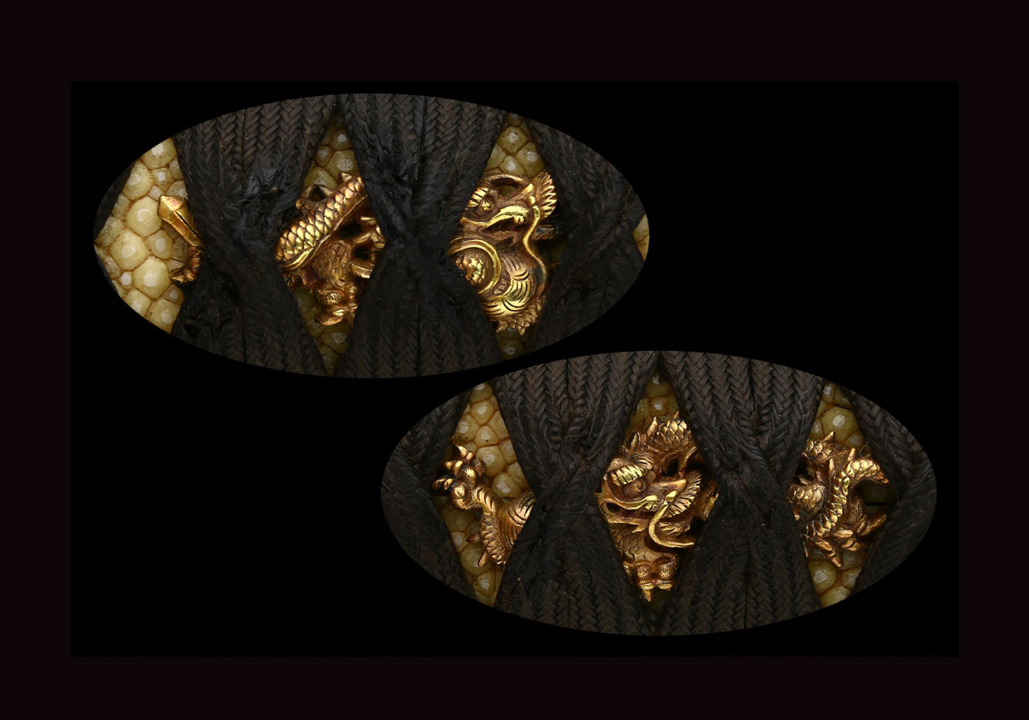 Hinshitsu-keijō: both hilts covered with white same and wrapped tsumami-maki style with black braid; daishō-menuki depicting creeping dragons, of pure gold, in katachiboiri; daishō-tsuba depicting an arrangement of three-fans crests, in tatemaru-gata, of shakudō with ishime ground, and with takabori relief, gold iroe accents, a kaku-mimi with a little niku, and two hitsu-ana each, signed as quoted above; daishō-fuchi depicting an arrangement of three-fans crests, of shakudō with ishime ground and with takabori relief and gold iroe accents, signed as quoted above; daishō-kozuka and kōgai depicting an arrangement of three-fans crests, of shakudō with ishime ground and with takabori relief and gold iroe accents, unsigned; daishō-saya in glossy black lacquer and with gold nacre décor of an arrangement of three-fans crests; daishō-kojiri undecorated and of polished