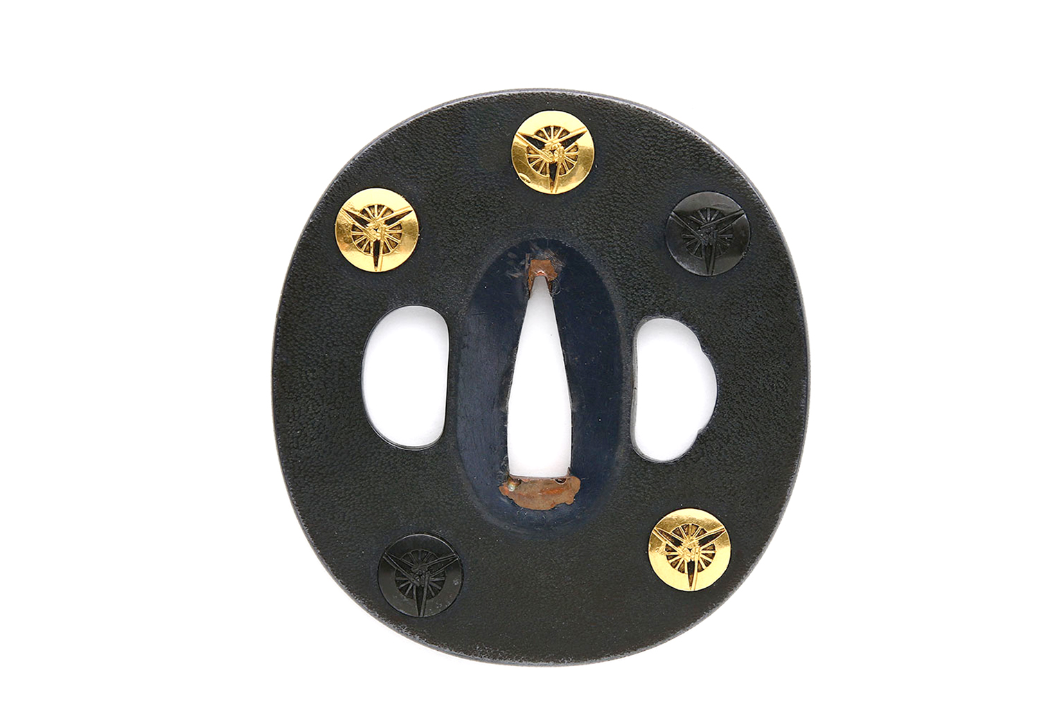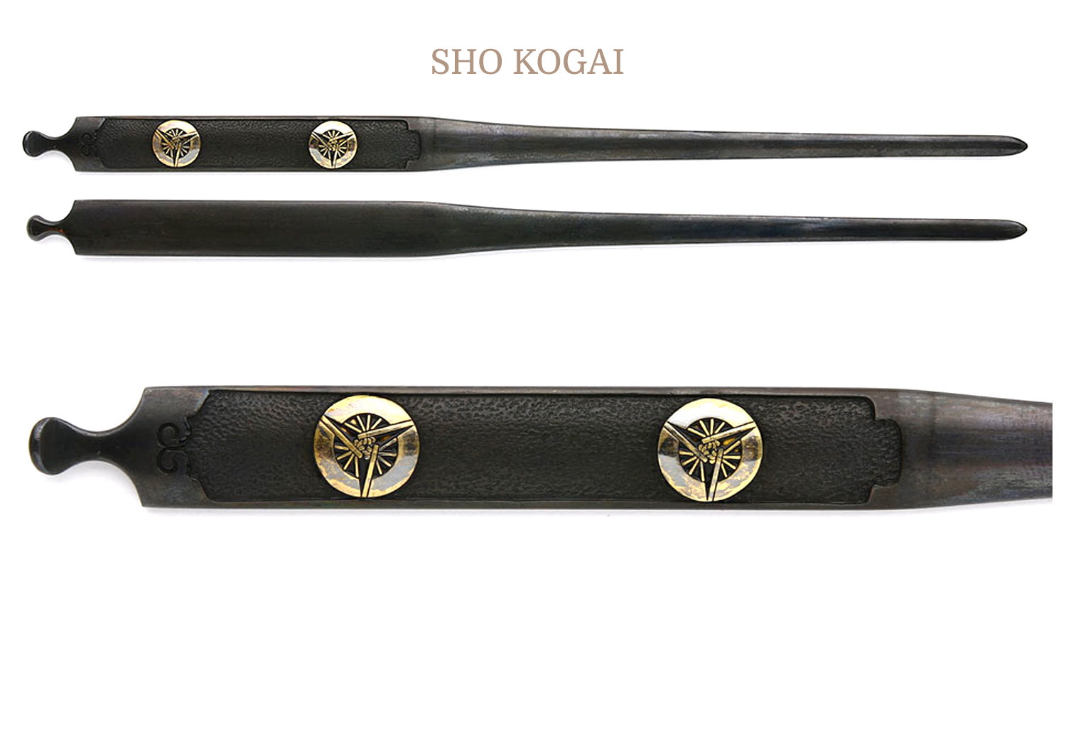 This is a Satsuma style daishō-koshirae with glossy black lacquer scabbards and fittings that are en suite decorated with an arrangement of three-fans crests. Kozuka and kōgai were added later, but fuchi/gashira and tsuba were made by the Satsuma-based kinkō artist Samejima Munenori (鮫島 宗徳). Dated works from the eras Tenpō (天保, 1830–1844) and Kaei (嘉永, 1848–1854) exist from Munenori, which inform us about his active period. The fuchi/gashira and tsuba are well made and a very valuable reference as only few works of this artist exist, in particular such that are dated.