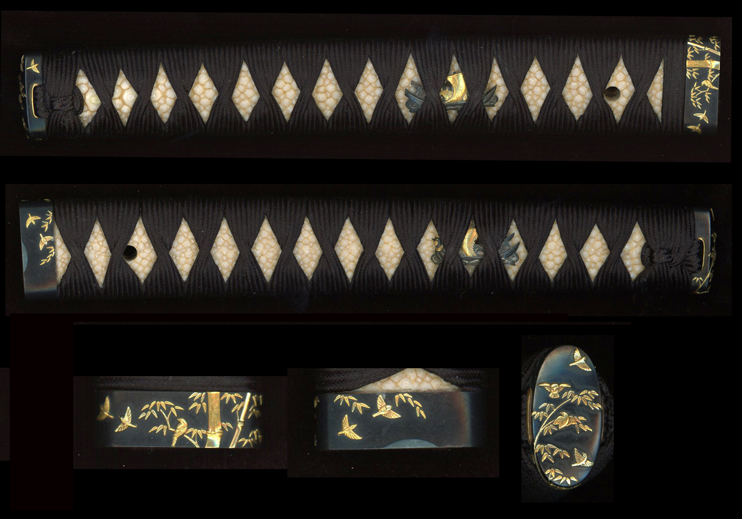 The theme of the fuchi and kashira is bamboo and sparrows. The craftsman, Yoshihisa, is of a lineage of artists with six generations using the family name of Tamagawa. The 1st generation was a disciple of Yatabe Michitoshi and an official worker of the Mito Clan. He passed away in 1796. The 2nd generation was the son of the 1st generation and passed away in 1835. Considering the features of the mei and craftsmanship, this fuchi and kashira was likely crafted by the 2nd generation. It depicts bamboo and sparrows by the use of gold zogan and iroe techniques on the shakudo surface. You can see the gorgeous display of the movements of the sparrows. It comes with NBTHK Tokubetsu Hozon papers.