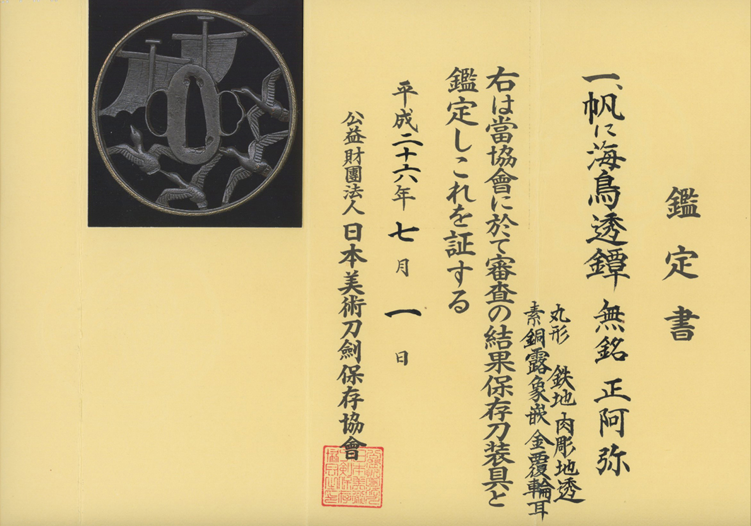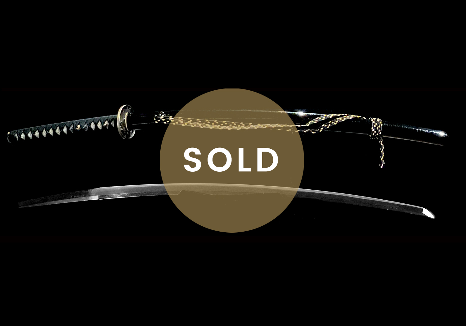 This katana comes in an old shirasaya the wood of which has been beautifully toned into a rich, dark color. It is also accompanied by a very nice koshirae. The saya of the koshirae is lacquered black in a ribbed pattern and is in excellent condition. The tsuba is from the Shoami school. It depicts seabirds in mid-flight with two ship’s sails in the background. You can almost feel the refreshing winds blowing gently. It shows well-balanced openwork with great movement depicted in both the birds and the wind-filled sails. The rim (mimi) is covered in a heavy lustrous gold foil. The Shoami school was established in Kyoto around the end of the Muromachi period (1500’s) and it then spread and prospered throughout the country during the Edo era. This tsuba measures 3.25 inches or 8.25 cm round. It comes with NBTHK Hozon papers attesting to the validity of the attribution and the quality and condition of the piece.