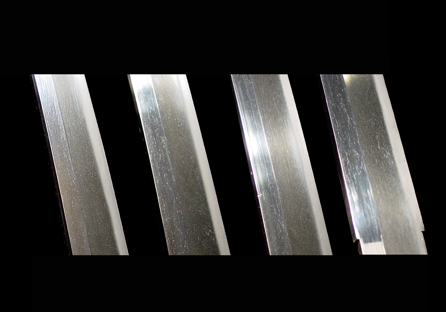 | JIHADA: | Ko–Aoe blades have a distinctive feature called chirimen-hada. The closest translation into English would be crepe-silk hada. Also, sumigane or dark spots are also frequently seen in the steel. Mokume hada will also be present either in the form of o-mokume or ko-mokume depending on whether the blade is nie based or nioi based. Often utsuri and chikei will appear showing the close ties with Bizen production.