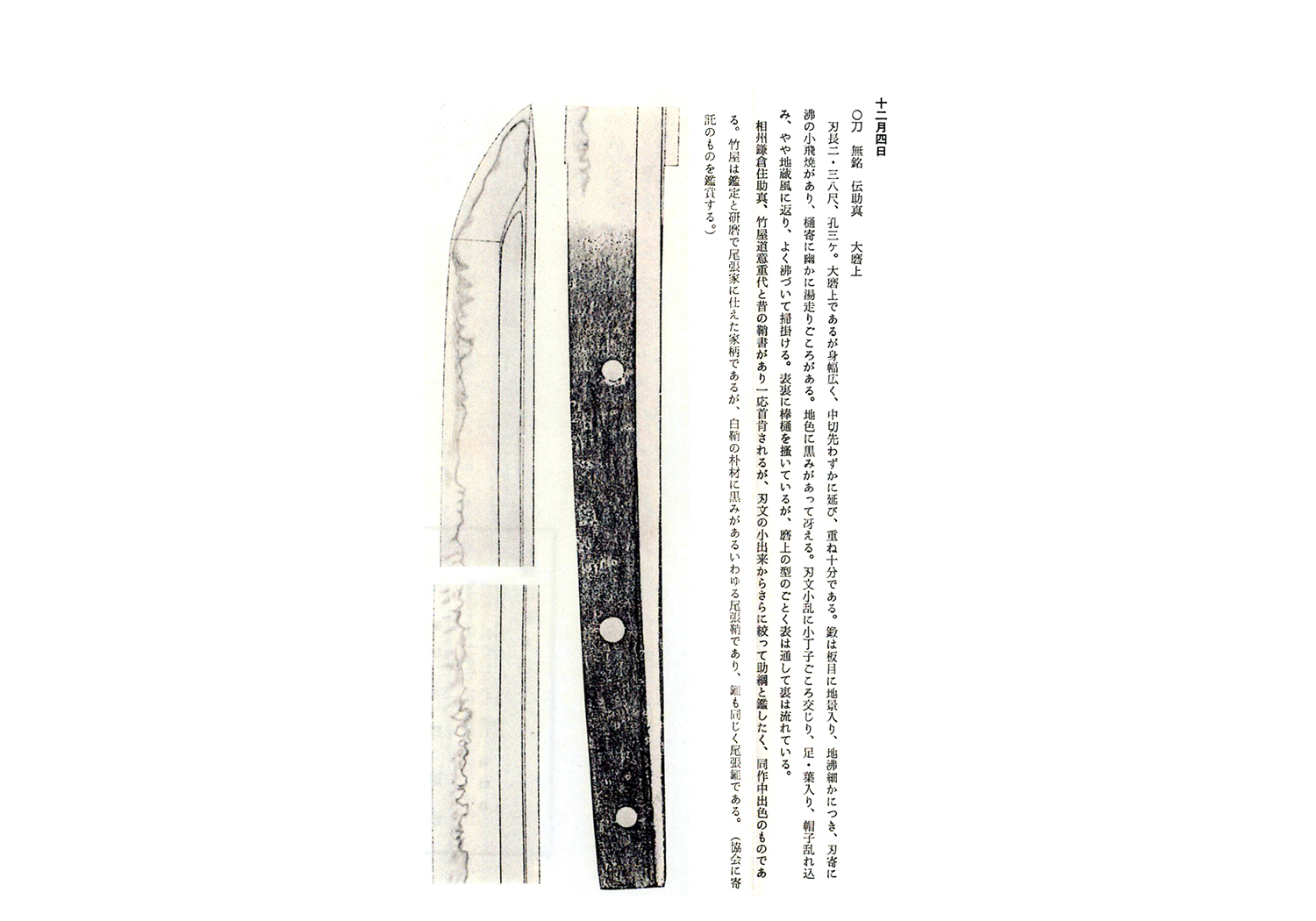 This blade comes with two shirasaya, a fact that is not too unusual in of itself, but in this case the old Edo period shirasaya has a sayagaki attributing the blade to “Sukezane, resident of Kamakura in Sagami province” (相州鎌倉住助真) and also states that it was a “heirloom of Takeya Dōi” (⽵屋道意重代). In fact, when Dr. Honma wrote his well-known publication, KANTO HIBI SHO back in the 1970’s, this blade is written up as number 380 in the first volume dated December of 1971. The write-up mentions this is a blade by Bizen Sukezane and no mention of Nagashige is made. Below is the oshigata, Japanese write-up from the publication, and the translation of same: