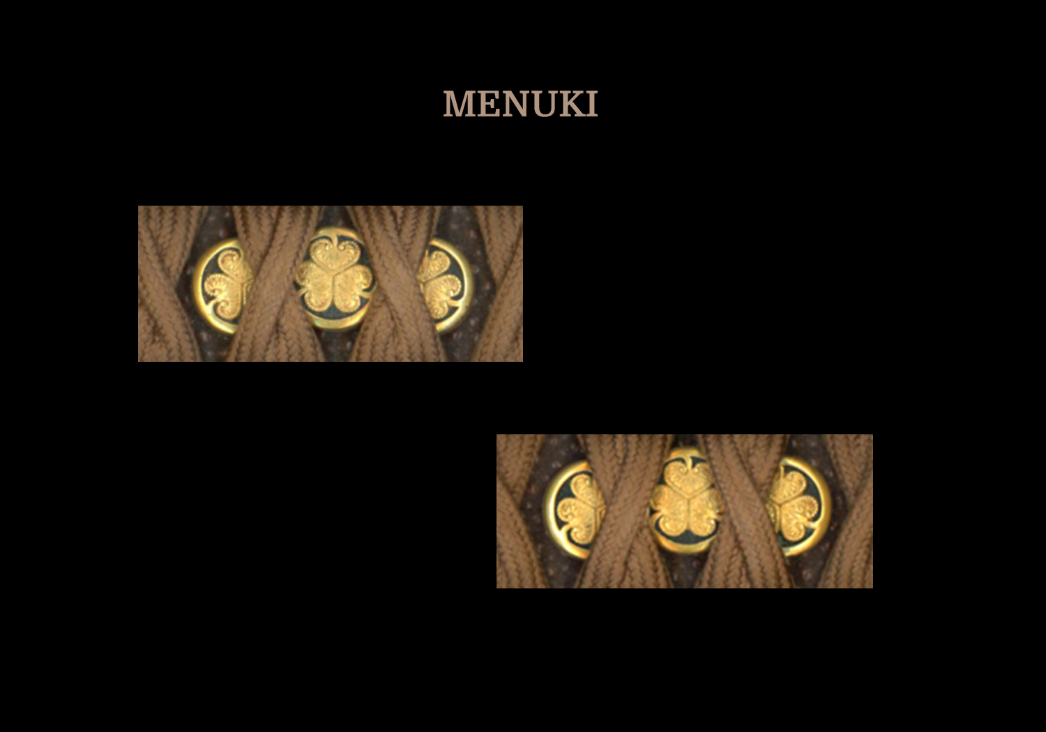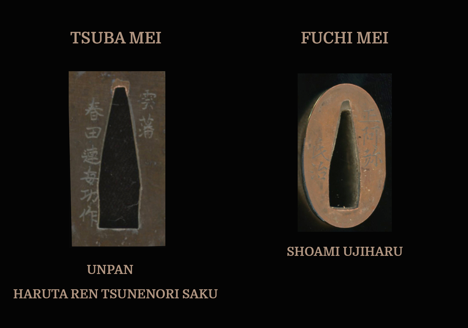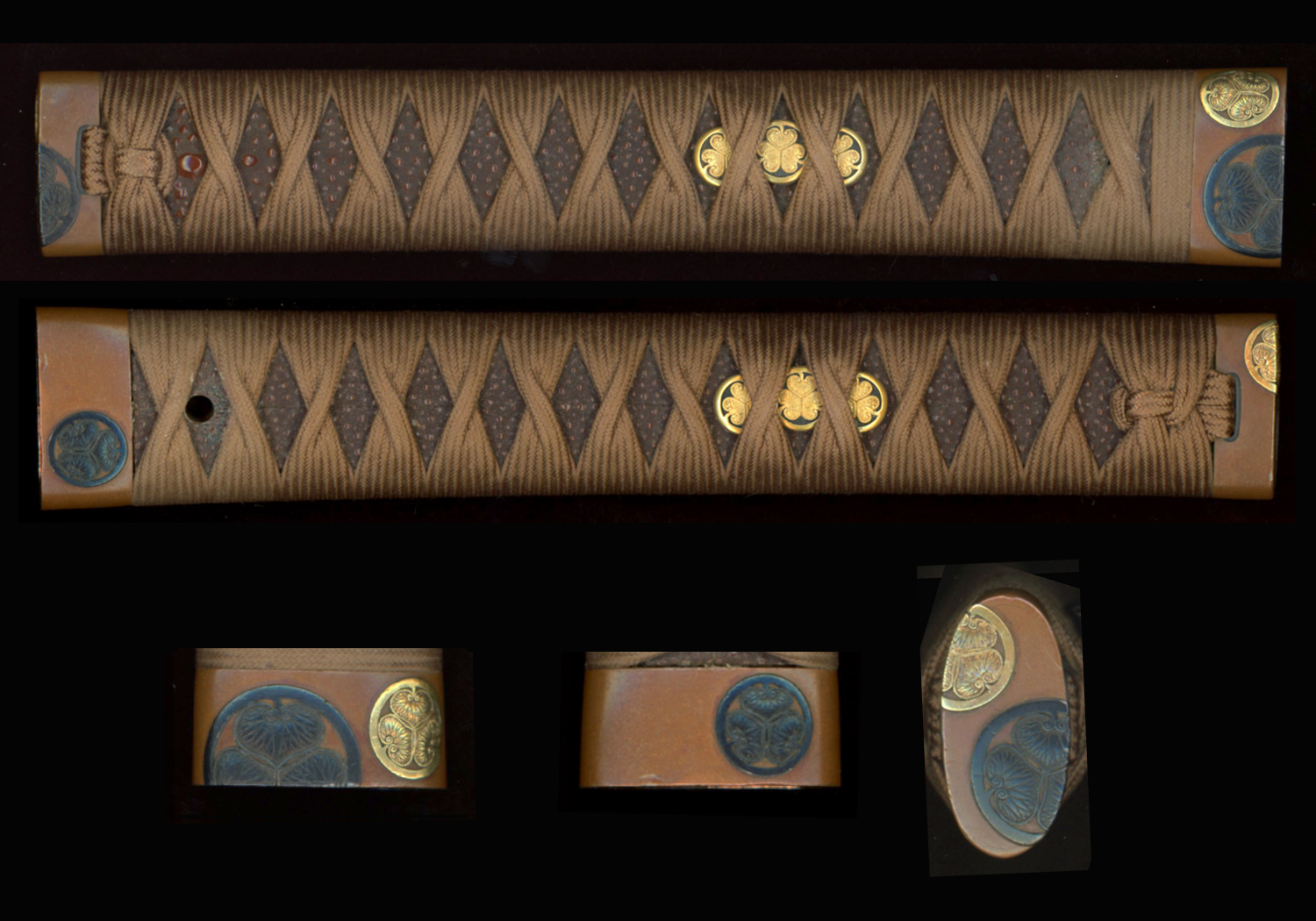 The fuchi and kashira are of copper and bear the Tokugawa mon. They are signed by their maker, Shoami Ujiharu (1650-1700) of Harima Province. The menuki are shakudo and gold also bearing the Tokugawa mon. All of these various kodogu seem to be contemporary with each other and are of top quality. This koshirae truly compliments the strength of the Bizen Nagashige katana that it houses.