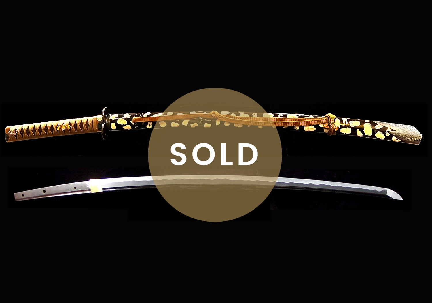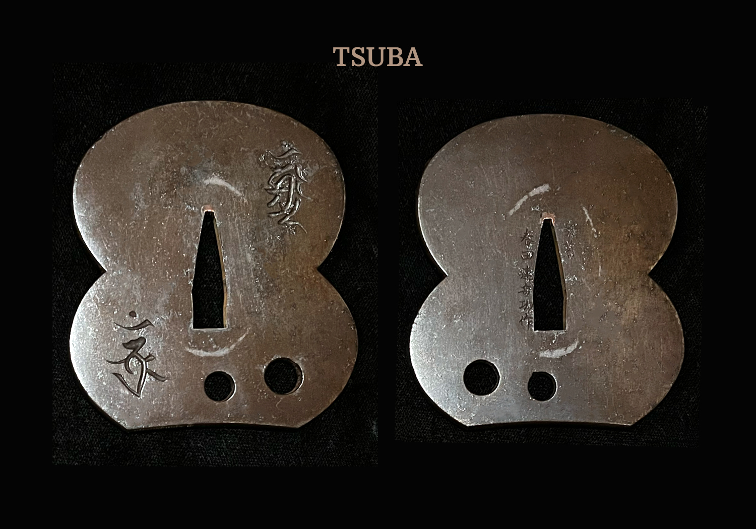 This blade also comes with a very interesting koshirae that was awarded Tokubetsu Hozon papers by the NBTHK. It is a large and robust koshirae that is very befitting of this sword. The saya is lacquered black with lots of large pieces of shell inlaid into the lacquer. The tsuba bears special mention. It is signed Unpan on one side of the nakago ana and Haruta Ren Tsunenori Saku on the other side. Tsunenori worked in Izumo Province and passed away in 1700. The shape of the iron tsuba is especially interesting. This shape is called a Daigaku shape. The name came from the first daimyo of Moriyama Domain in Mutsu Province. His full name was Matsudaira Daigaku no Kami Yorisada (松平大学頭頼貞 1664-1744). He was affiliated with the Mito Tokugawa branch and he developed this particular shape of tsuba to his personal taste. In fact, he developed this shape with the famous fittings maker, Tsuchiya Yasuchika whom he hired. Yasuchika went on to make many tsuba in this shape and in deference to his lord, Yorisada, he named this shape “Daigaku”.