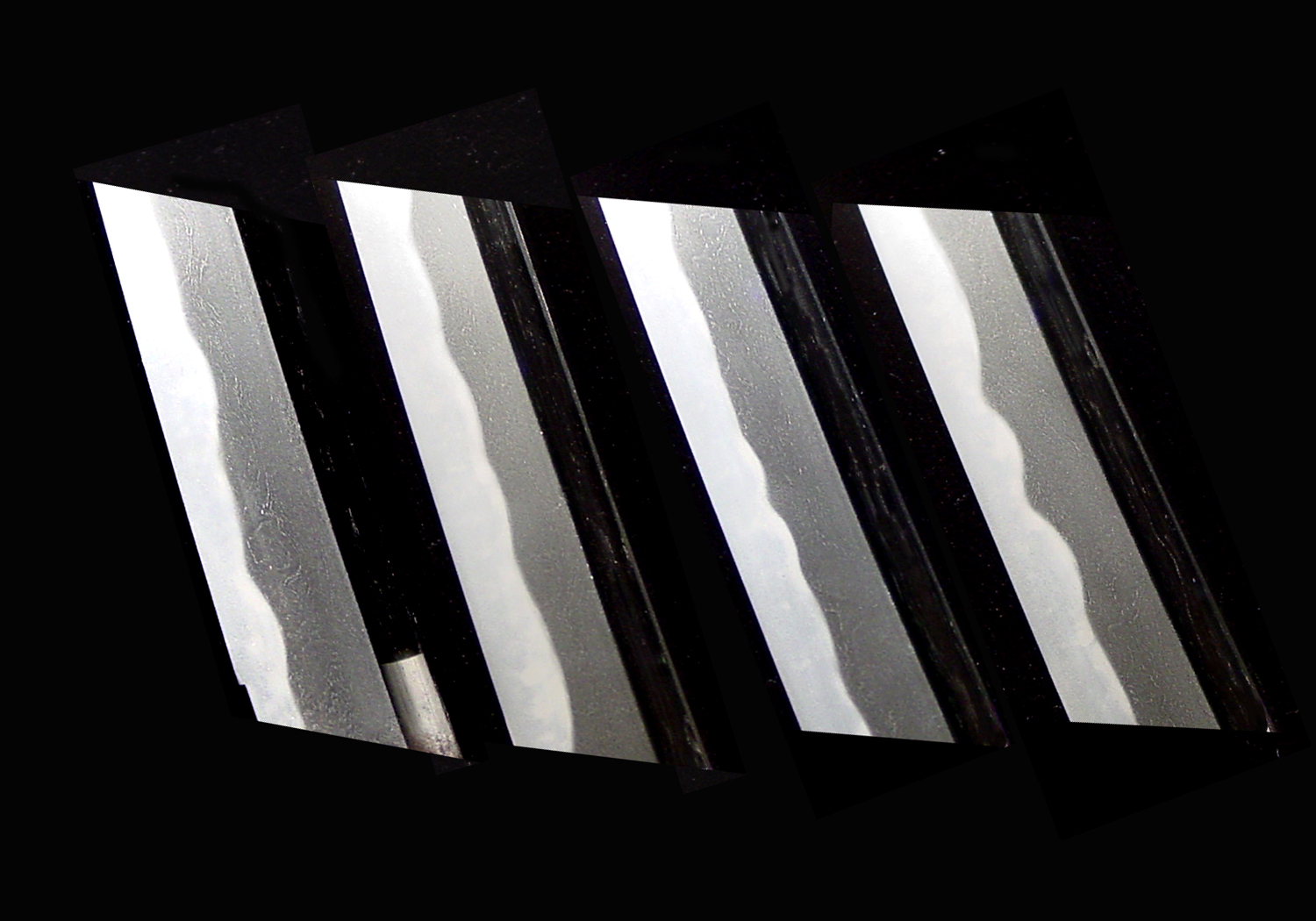 Jitetsu and Hada: The texture of the steel differs from the omote to the ura….the Omote is made itame which runs into a sort of masame-like effect. The ura is in mokume mixed with itame and there is an abundance of ji-nie on both sides. There are also chikei in places and jifu utsuri.