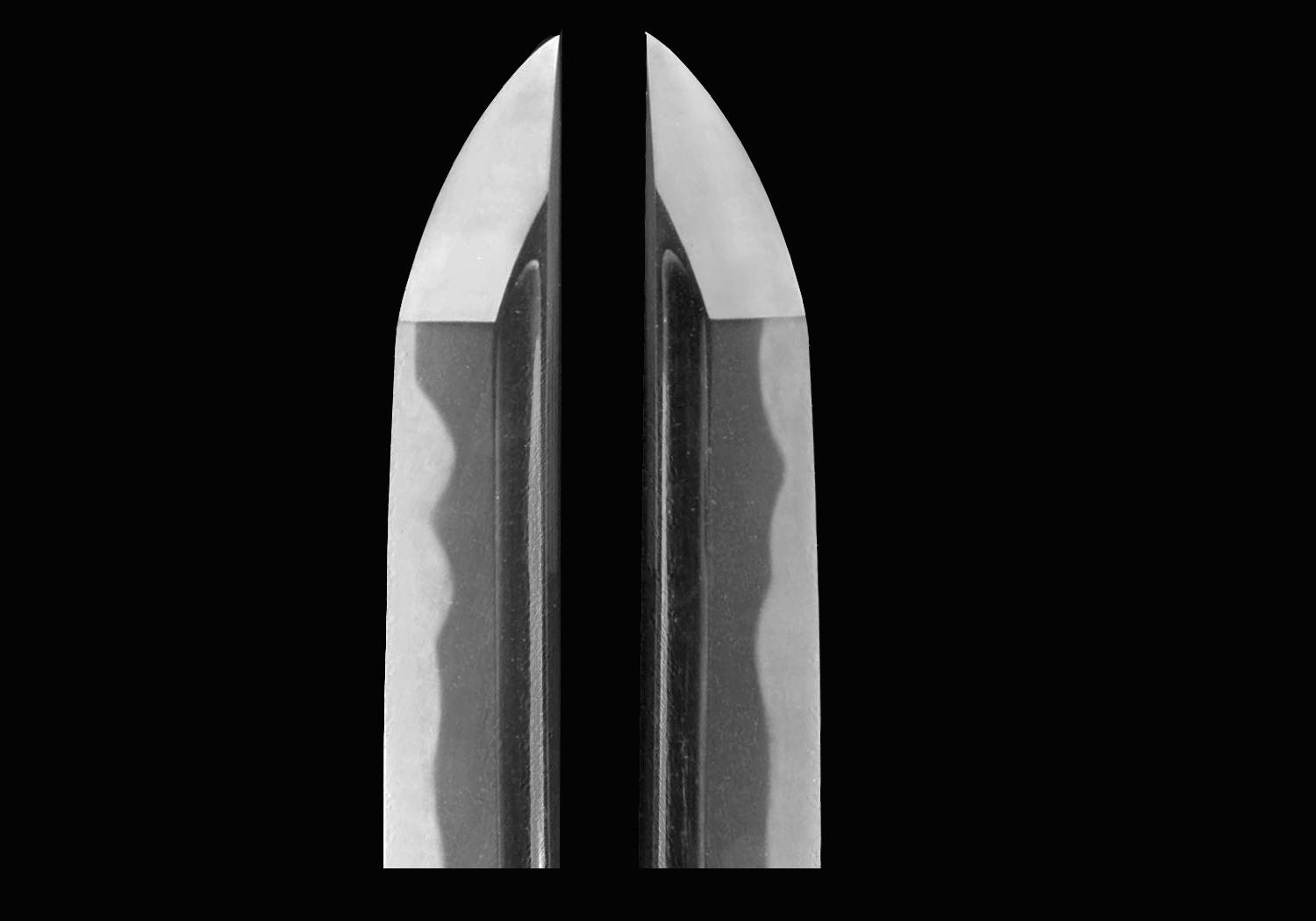Hamon: nie-laden and gently undulating notare-chō with a bright and clear nioiguchi that is mixed with ko-gunome, ko-chōji, some togariba, rather densely arranged midare elements, many ashi and yō, kinsuji, sunagashi, and small tobiyaki