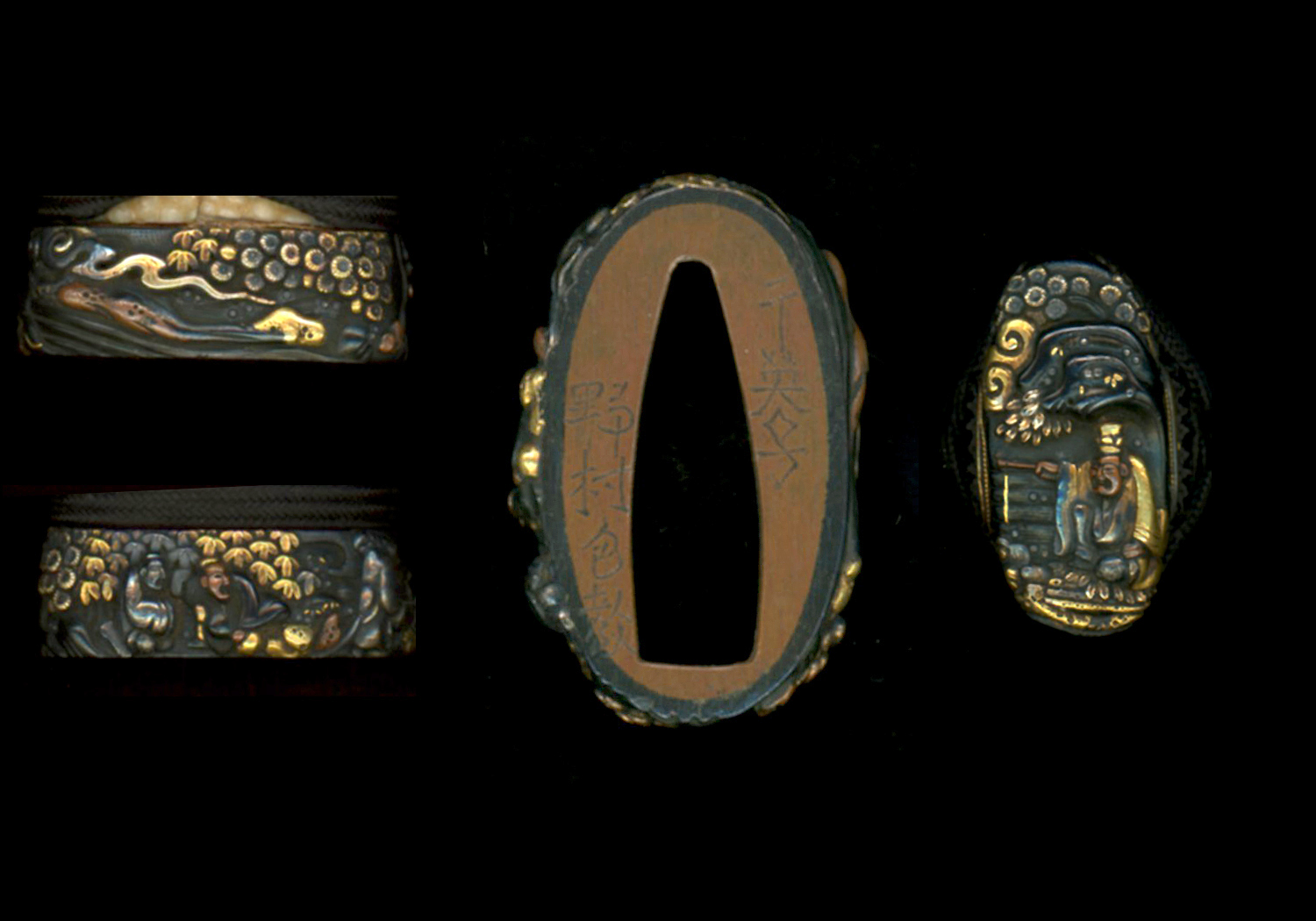 This set of fittings consists of a tsuba and a tsuka. The tsuba is 2 7/8 inches by 2 ¾ inches. It is made of shakudo that is very dark showing a high gold content. It is carved in very high relief depicting Chinese sages, trees, and a horse on the obverse. All of the carvings are highlighted with the use of gold, silver, and copper. The obverse is signed, Kaneishi, Nomura Kanenori sei (干英子, 野村包教製). The reverse is also carved in high relief with a house, trees, and a sage seated on a rock. The reverse is signed Gôshû Hikone jû (江州箱根住).