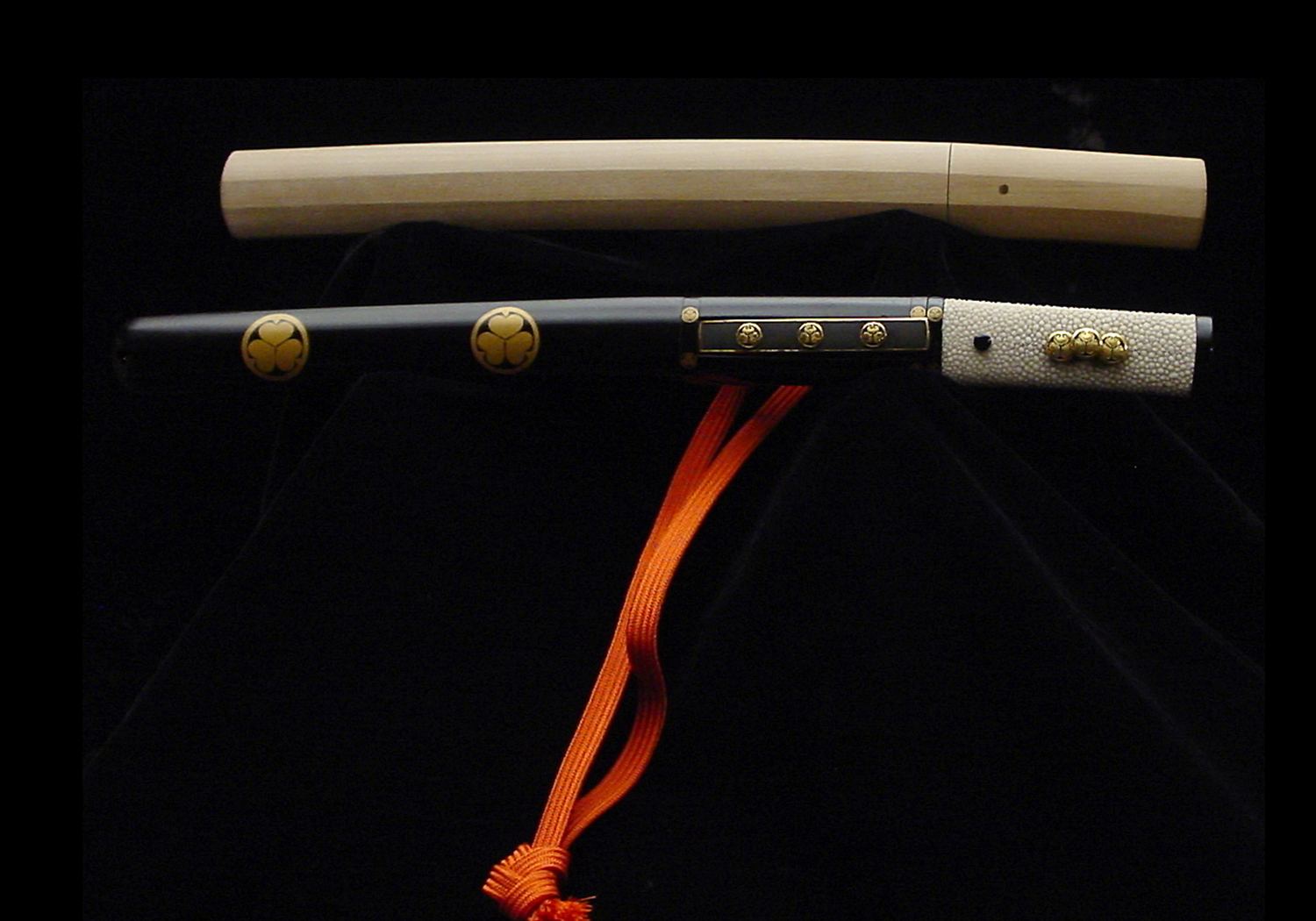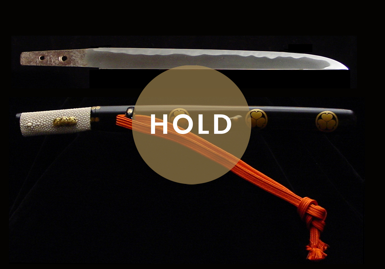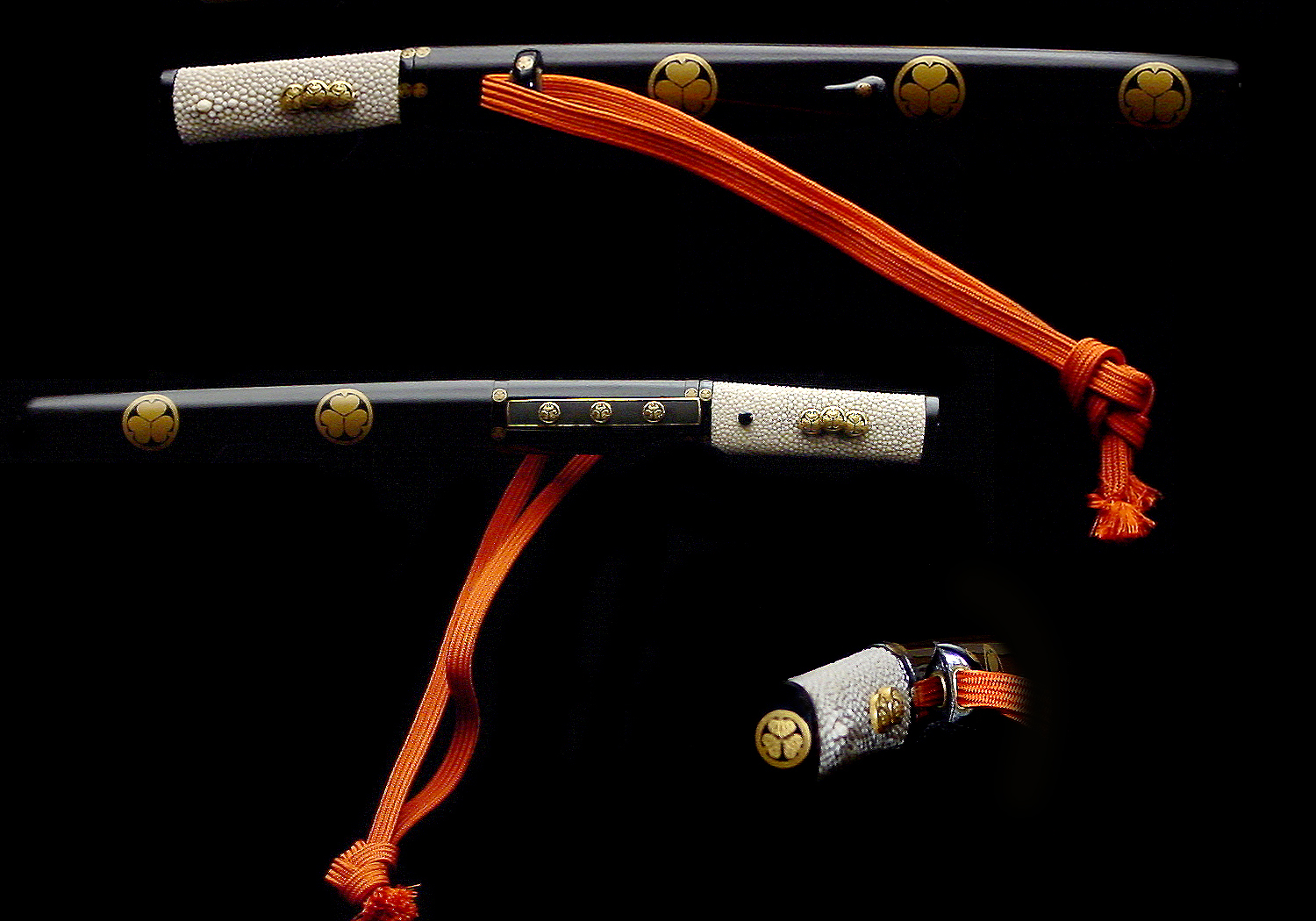 This tantô comes with a lovely koshirae. That is an exact duplicate for a tantô koshirae shown on a blade in the Owari Tokugawa collection. It is simple yet tasteful with 21 Tokugawa mon in gold lacquer on a black lacquer background. Each of the two gold menuki on the same wrapping the tsuka (handle) are also comprised of three Tokugawa mon. This makes a total of 27 Tokugawa mon on this tantô koshirae. Since the two tantô koshirae are exactly the same, it is logical to conclude that this Moriie tantô also, at one time, belonged to the Owari Tokugawa family and was, during the Edo era, gifted by the Tokugawa to the Yamanouchi Daimyô family of Tosa where it remained until after the Meiji Restoration when it went into private hands.