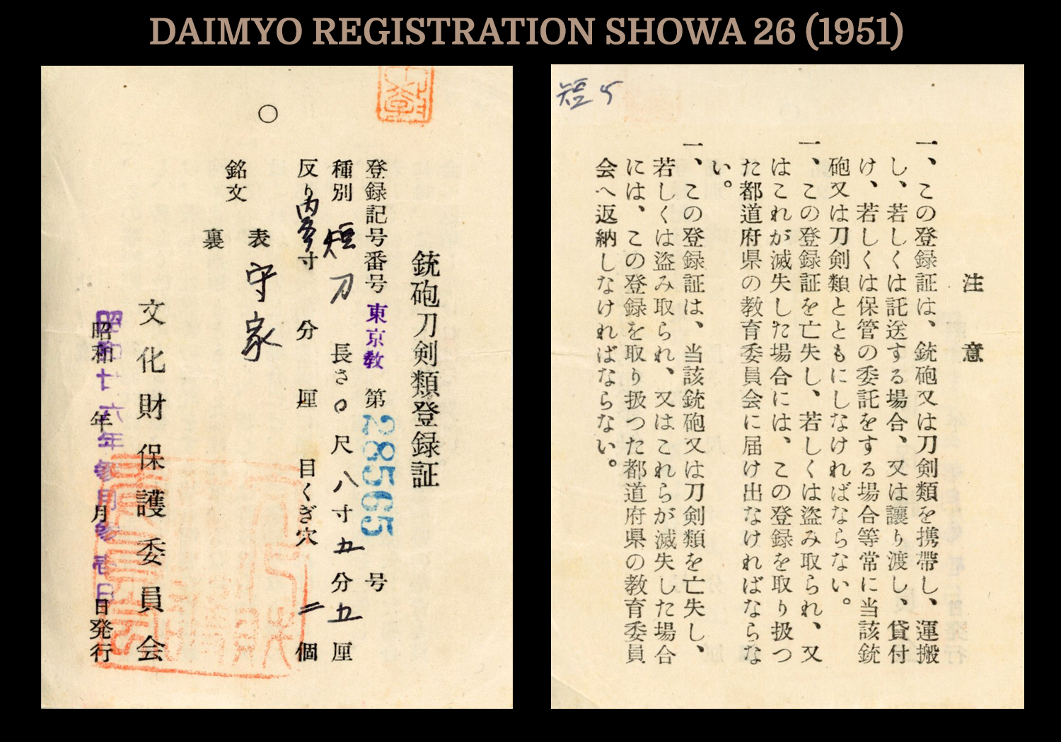 Of special note is the fact in 1951 when the government required that all swords must be registered, they began by registering all the swords that were in the possession of the former Daimyô families. This tantô was, in fact, one of the swords that was registered in that very year which is a testament to the high ranking of its owner at that time. A copy of the original registration document is shown below.