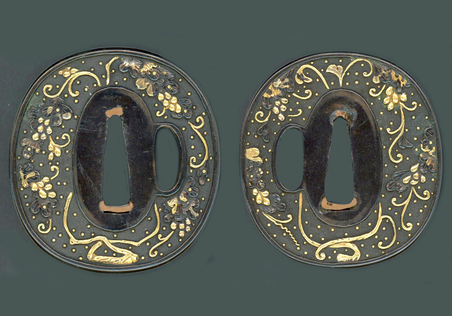 This is a very attractive Ko-Kinko tsuba from the Muromachi Era.  It is slightly oval and measures 2.5 inches or 6.4 cm by 2.35 inches or 6.0 cm.  It is made of a rich and dark shakudo evidencing the high gold content in the shakudo.  It is covered on both sides by a beautiful floral pattern done in gold and shakudo on top of a very fine nanako background.  The mimi is raised and is made of smooth shakudo.  This is an absolutely exquisite piece.