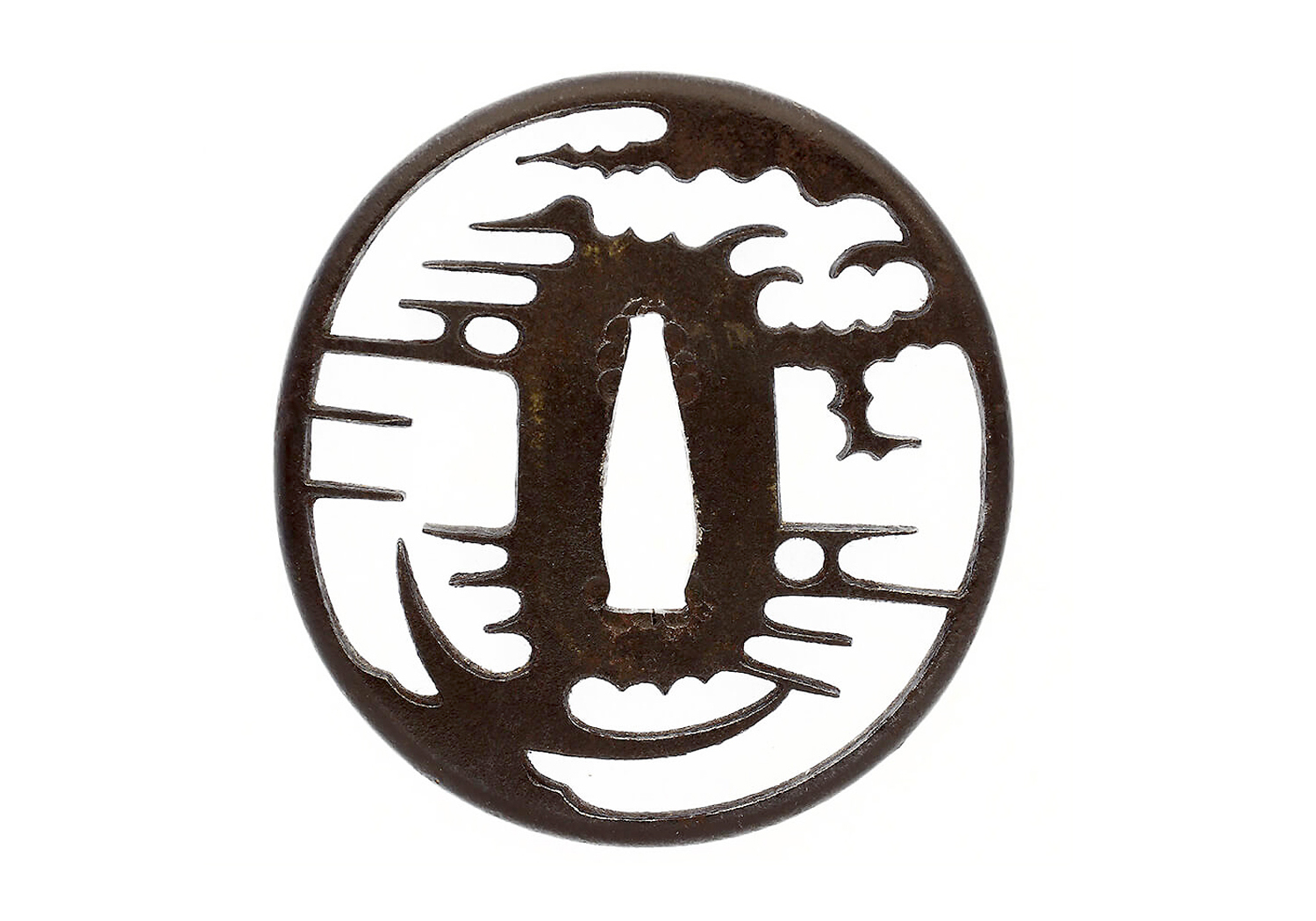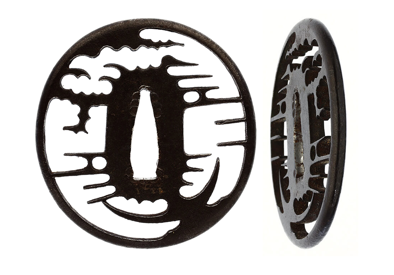 This sword comes with a very attractive koshirae that is in excellent condition. The saya is covered in shagreen (sharkskin) that has been painstakingly treasured and is without nicks, chips, etc. The tsuba is iron and of the Higo school done in sukashi (openwork) depicting clouds and a crescent moon. The fuchi/kashira are done in a combination of shakudo nanako and gold depicting sea birds in flight over waves. They are very impressive. The saya has a kurikata and kaerizuno done in suite with the fuchi and kashira. These pieces depict the same pattern and designs. The menuki are of dragons and appear to be solid gold. They are exquisitely carved and in superb condition. There is a kozuka made of shakudo nanako on the front and gold color on the reverse. There is a shakudo and gold war banner and commander’s baton on the front. All in all, a very nice set of koshirae worthy of housing this great Jûyô Tôken by Nagamitsu.