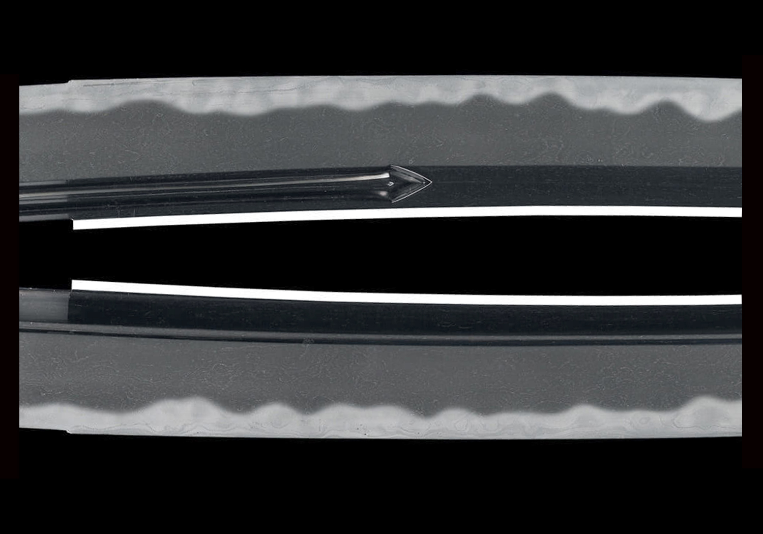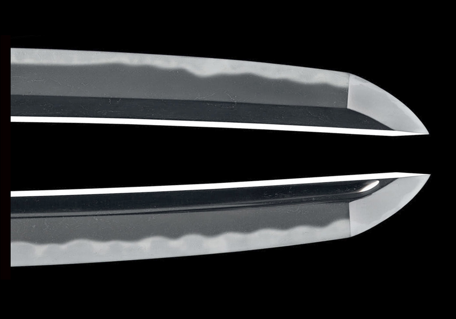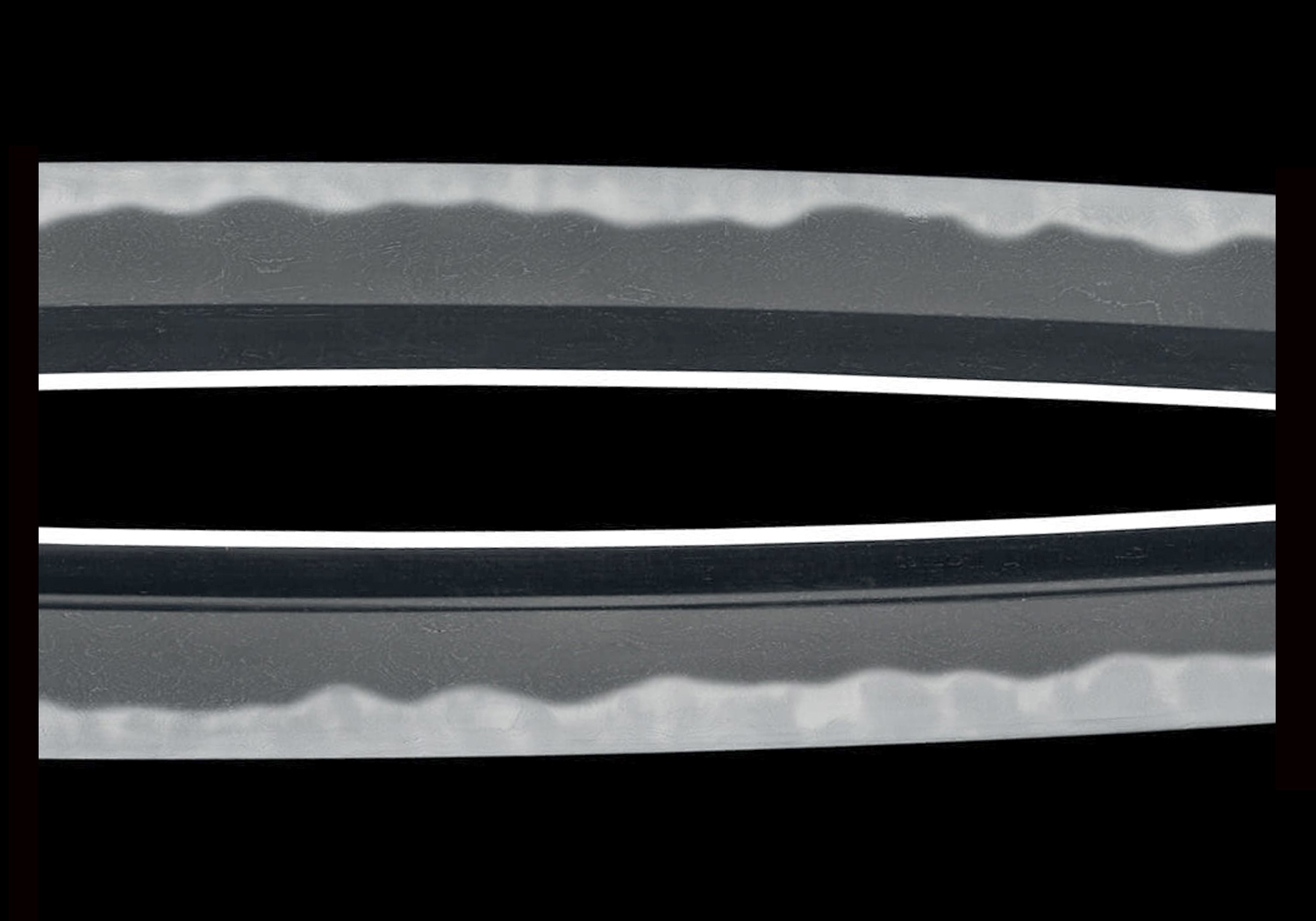 JITETSU: The kitae is ko-itame mixed with small mokume, making a fine and beautiful grain. The ji-nie is also fine and the midare-utsuri or chôji-utsuri will appear in a pronounced manner.