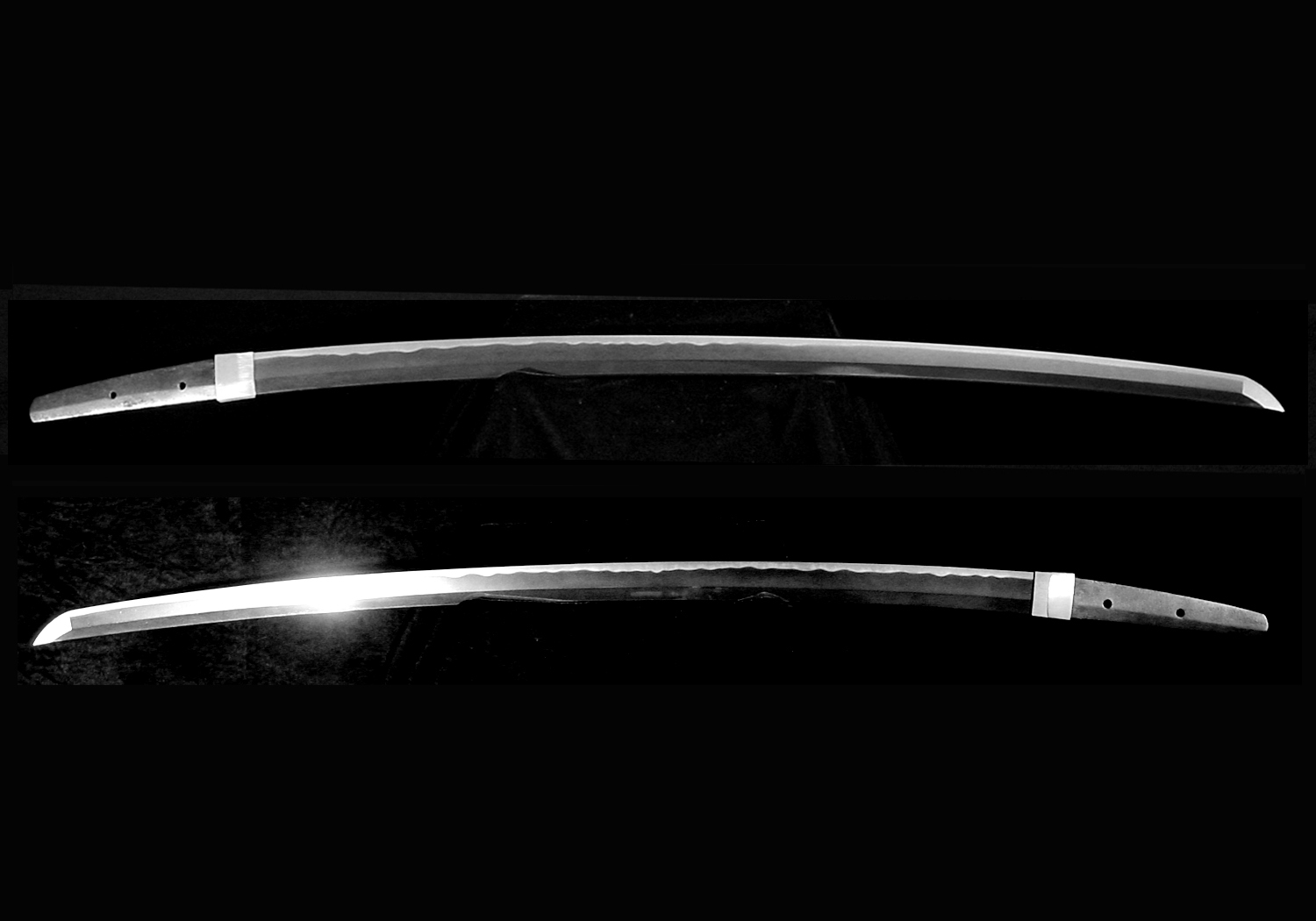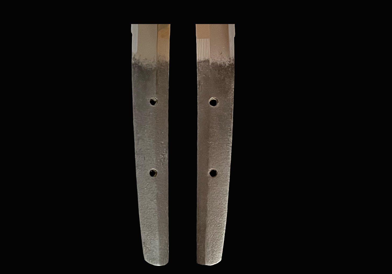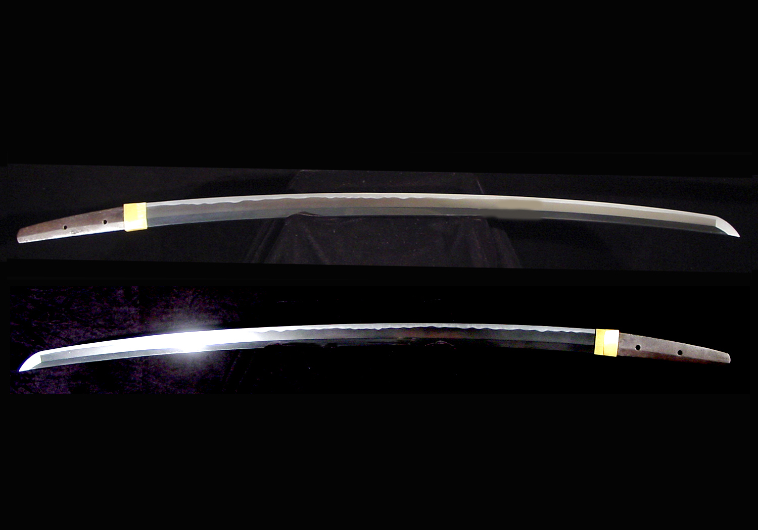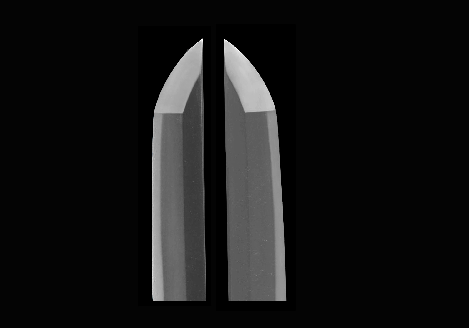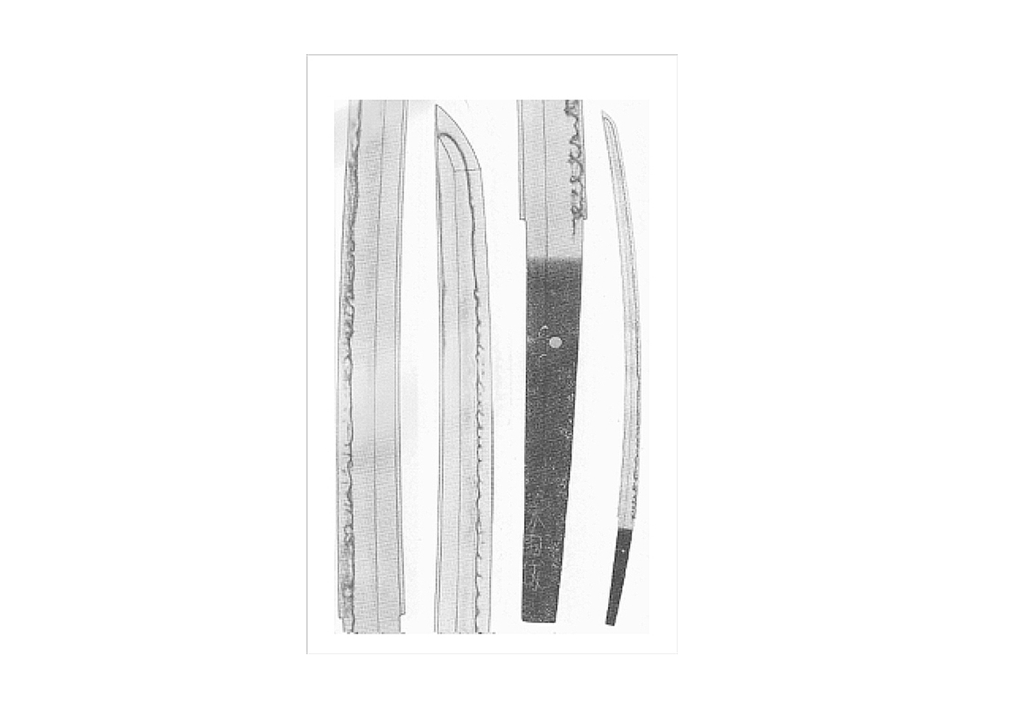 Nakago: Ubu long swords will have a long and gracefully curved nakago with a chestnut-shaped tip slanting toward the ha(ha-agari kuri-jiri). File marks (yasurime) will be straight across (kiri). Ubu tantô will have a nakago that is kimono-sleeve shaped with a shallow kuri-jiri shaped tip. The yasurime will be katte-sagari.