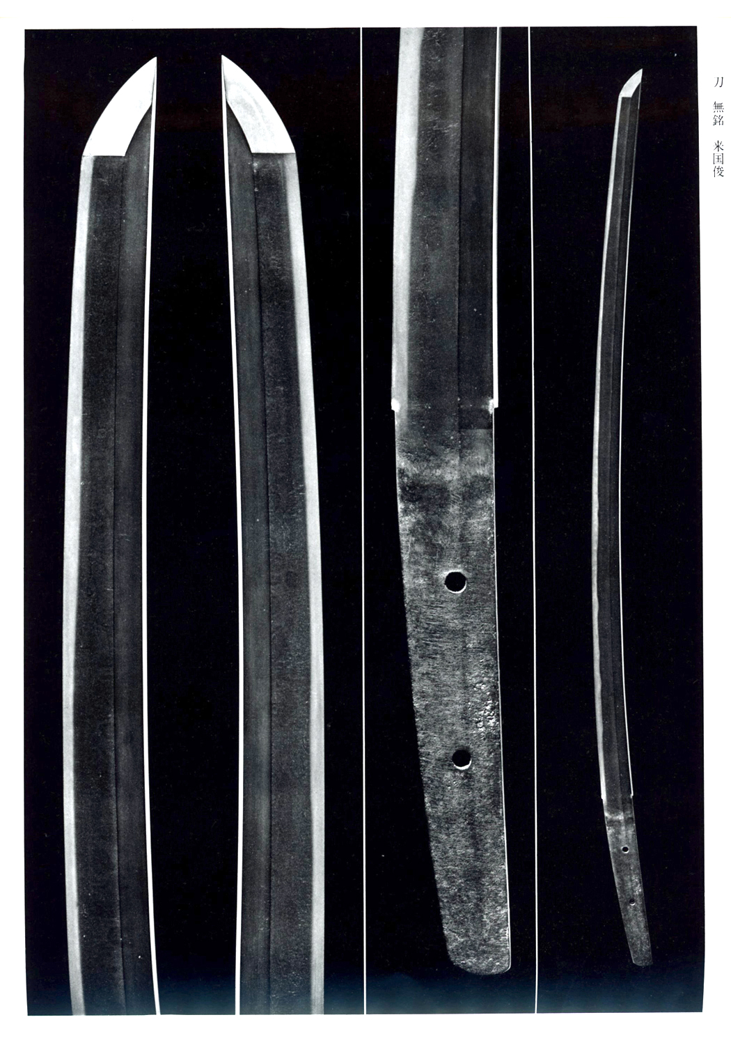 Nakago: ō-suriage, kurijiri, katte-sagari yasurime, two mekugi-ana, mumei