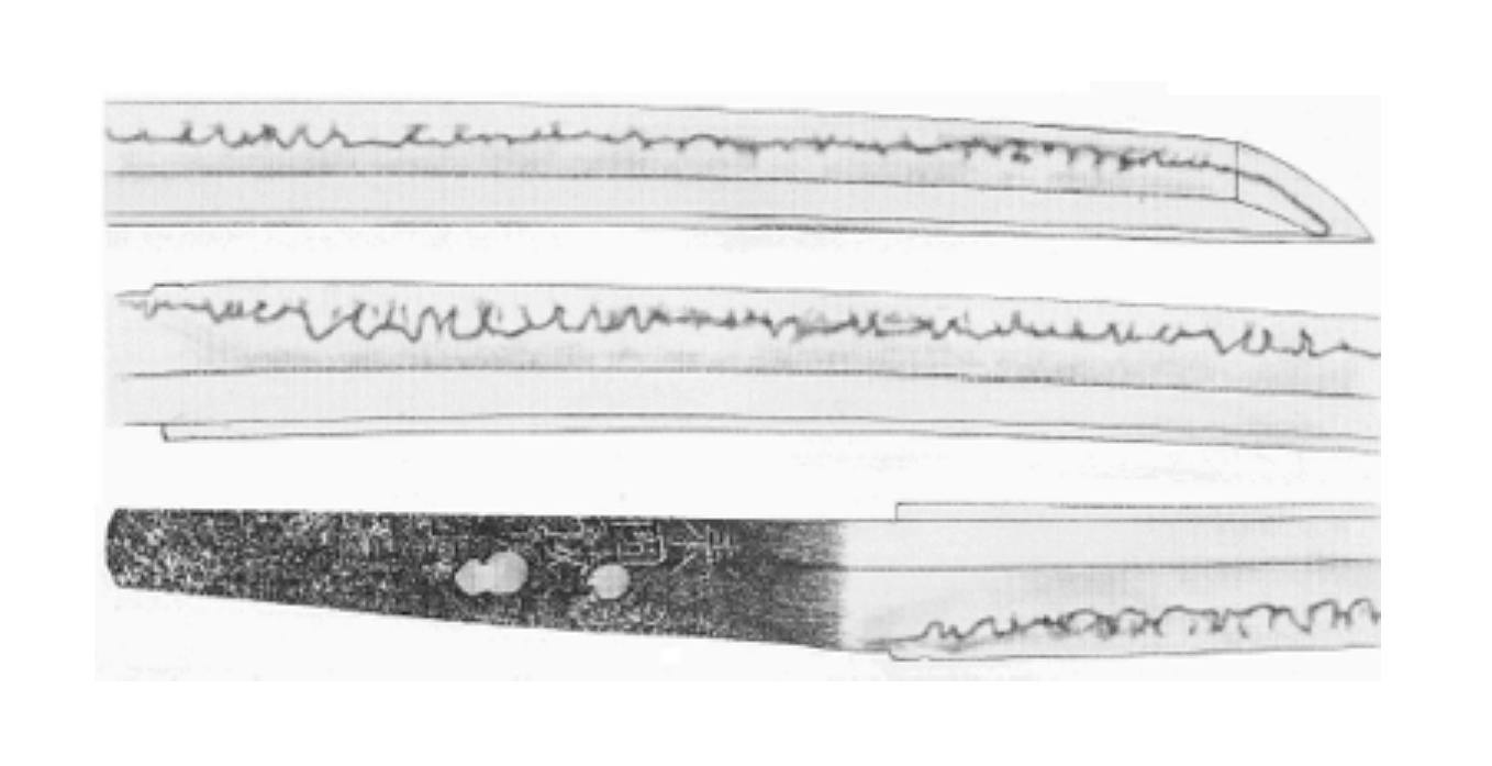 Bôshi: A variety of temper patterns can be found in his bôshi. Most prevalent his tachi will have an o-maru boshi sometimes with hakikake. Often a good portion of these long swords will be tempered in a yaki-fukai style with a short kaeri or almost no kaeri. Tantô will have a small rounded tip and a longer than usual kaeri. Sometimes niju-ba can be found within his bôshi.
