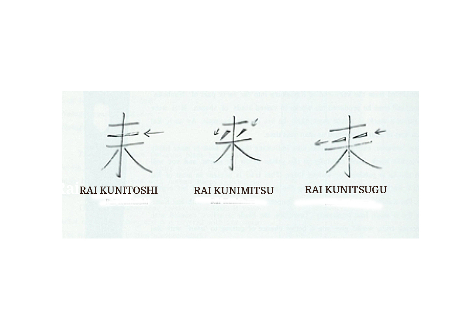 Rai Kunitoshi (来国俊) wrote his kanji, “Rai” in a distinctive way that differed from the mei of Rai Kunimitsu (来国光) and Rai Kunitsugu (来国次). He chiseled the second and third strokes in one straight line. Also, he wrote those lines from right to left, rather than the normal left to right. This is called saka-tagane or reverse chiseling. For an example, please see the comparison chart below.