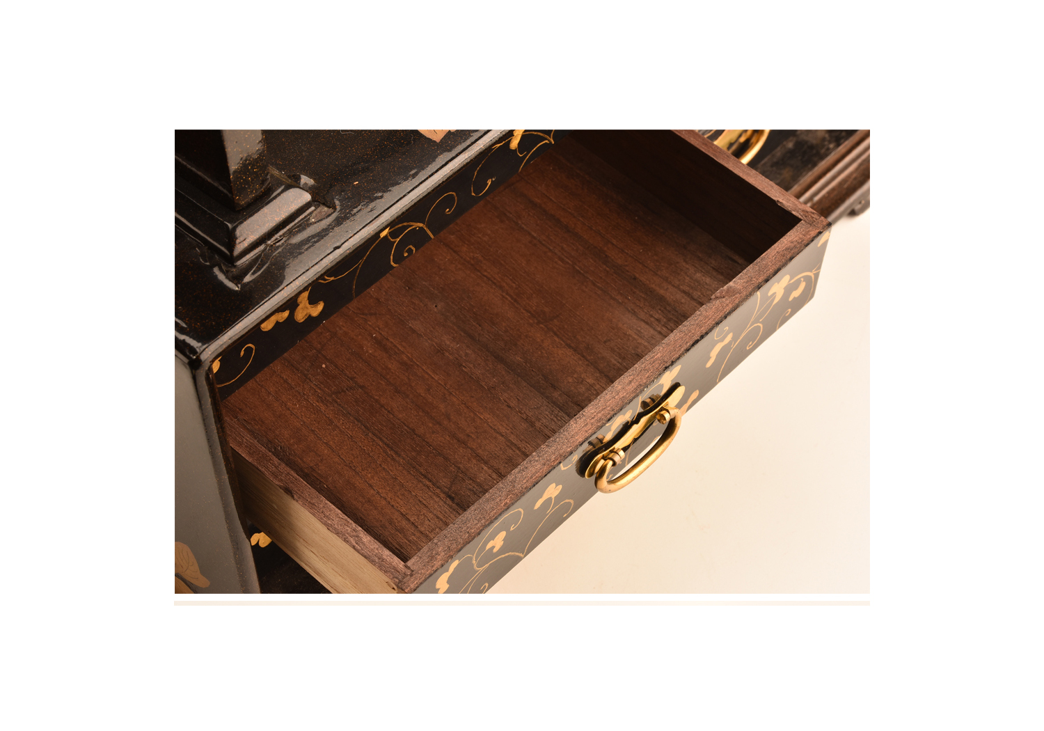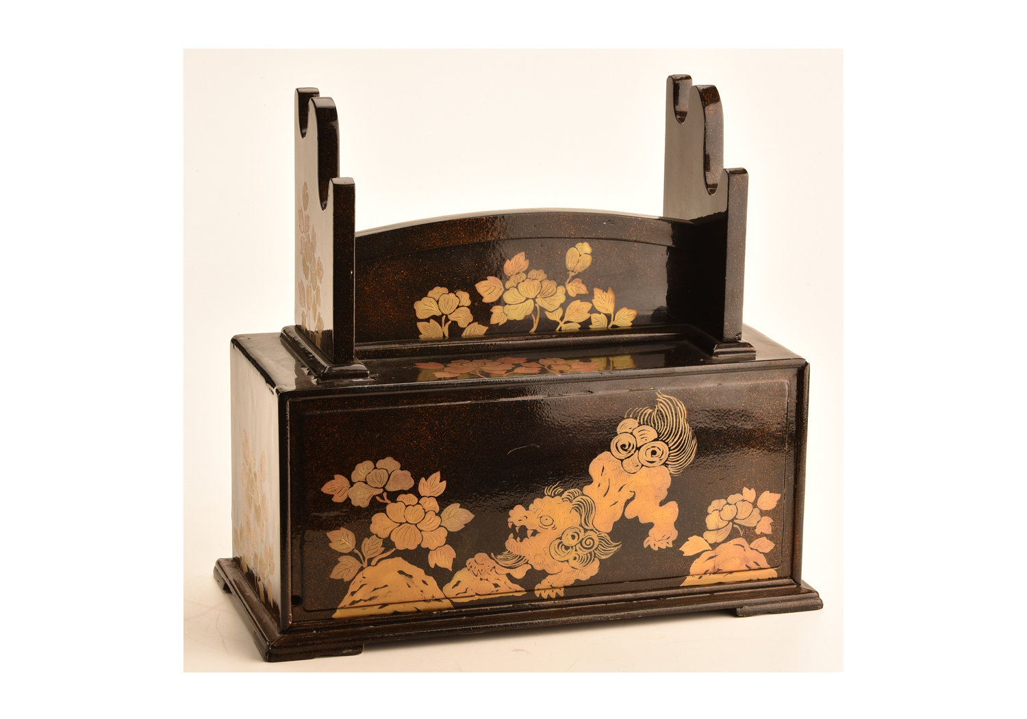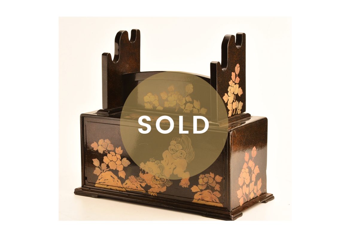 This is a very attractive sword stand for two swords. It is a very convenient size measuring 14 .625 inches wide, 14.25 inches tall, and 7.5 inches deep. It is lacquered in a dark brown lacquer with a design of a shishi lion/dog and flowers done in gold lacquer. There are a very few minor losses and cracks to the lacquer as one would expect from age, but overall it is in excellent condition.
