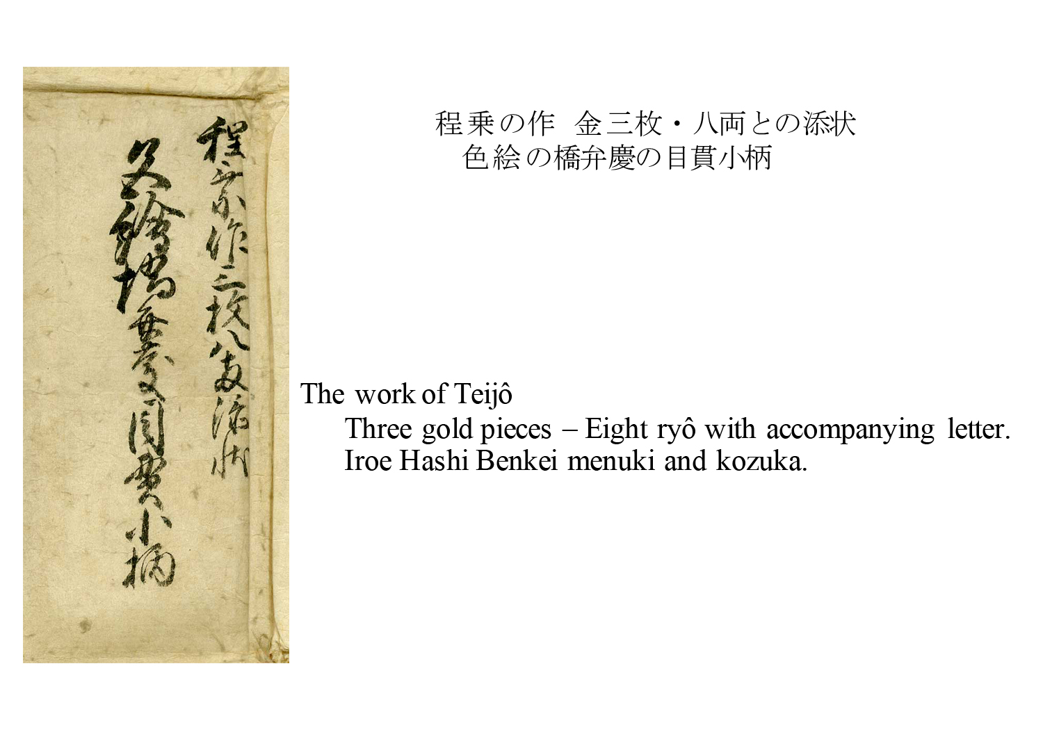 This work depicts the gorgeously carved scene of Ushiwakamaru (⽜若丸), i.e., the young Minamoto no Yoshitsune, fighting the warrior monk Benkei on the large Gojō (五条) Bridge in Kyōto, and the actions of each of the figures is interpreted in a truly lively manner. This futatokoromono set comes with an accompanying documentation (soejō) written by Teijō’sson and heir Etsujō Mitsukuni (悦乗光邦), in which he certifies that this is an authentic work of his father. Such a soejō is regarded as reliable as if the work was signed by the artist. Incidentally, appraising soejō by Etsujō Mitsukuni are extremely rare and valuable.