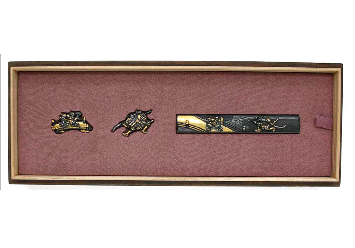 The futatokoromono presented here are a fine example of the skill of Gotô Teijô. The kozuka and menuki tell the story of the duel on the Gojo Bridge in Kyôto between Musashibo Benkei and Ushiwakamaru who later became known as Minamoto Yoshitsune.