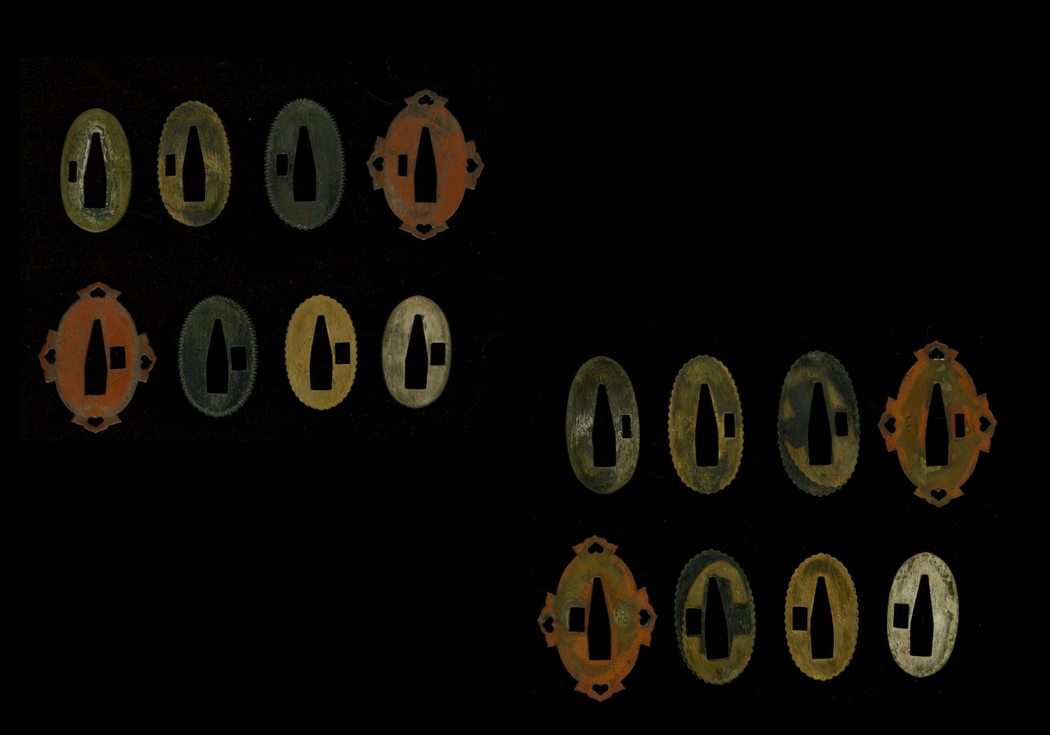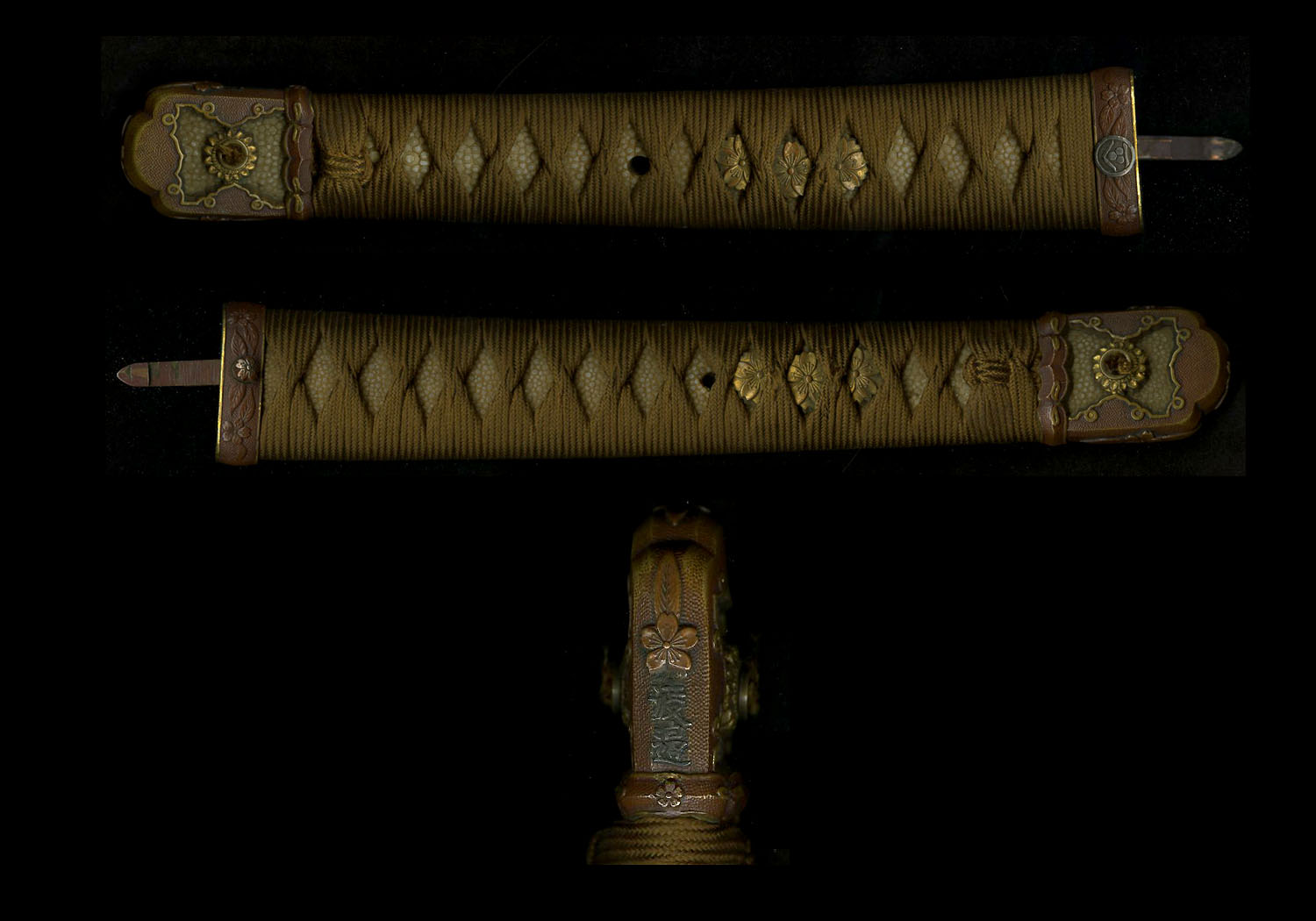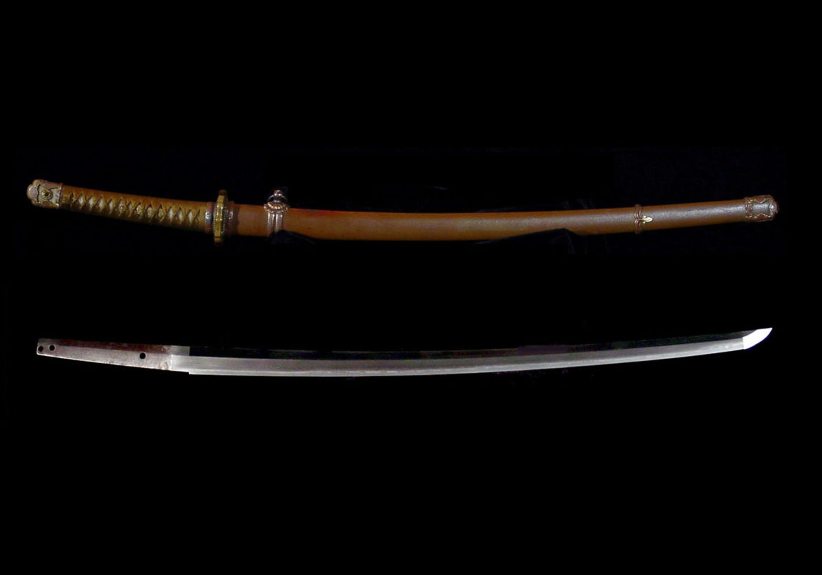 This blade comes in a full set of WW 2 army koshirae. The condition of this koshirae is superb with only the sarute missing. The tsuba is sukashi of the type one finds on only the best koshirae. All of the parts of the koshirae are original and have matching numbers including the seppa. The fuchi has the Watanabe family mon. A family mon can be found on army koshirae from time to time, but this koshirae also has the Watanabe family name written in kanji on the kabuto-gane. This is VERY RARE. There were three branches of the Watanabe family who used this kanji and they all became Viscounts or Barons after the Meiji restoration. This sword possibly belonged to one of their descendants. In any event he must have been wealthy and high ranking to justify these mounts. It is extremely difficult to find this quality of mounts in this condition these days.