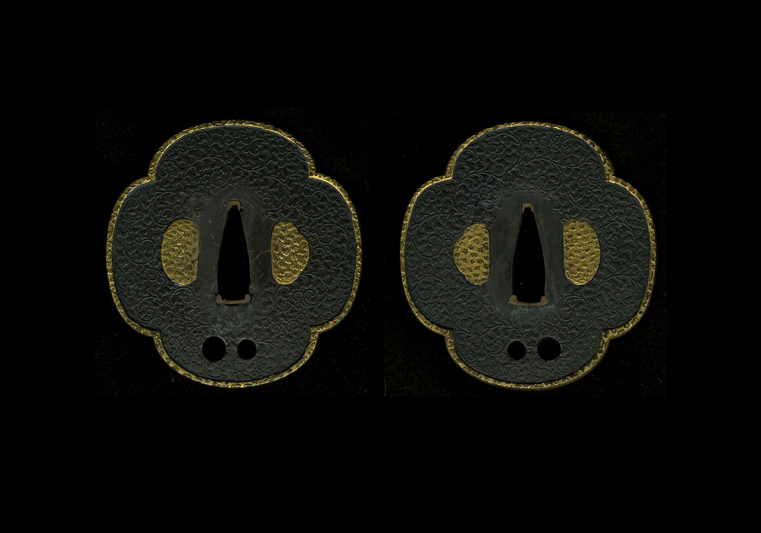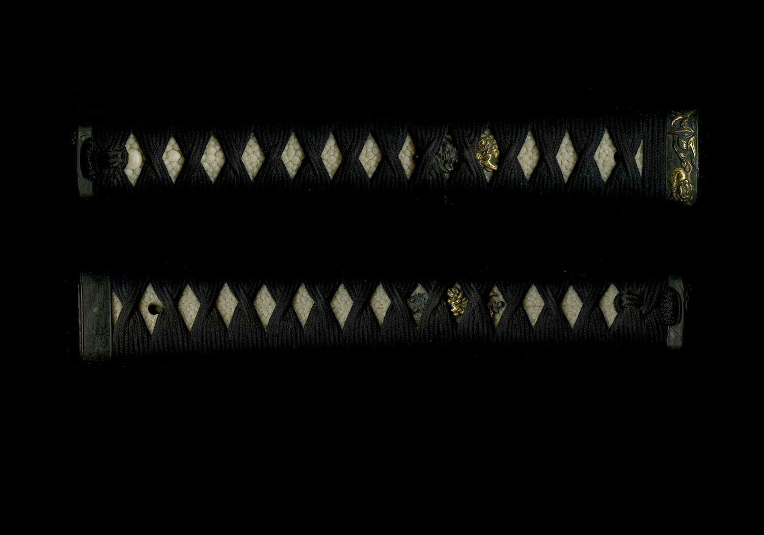 This blade comes with a fine set of koshirae from the Edo era. The black lacquered ribbed saya is beautifully made and in almost perfect condition. The tsuba is shakudo with a brass rim. The plate of the tsuba is delicately carved on both sides with leaves and tendrils. The brass rim is also carved. The fuchi, kashira, and menuki are all of shakudo and gold and depict shishi lions frolicking.