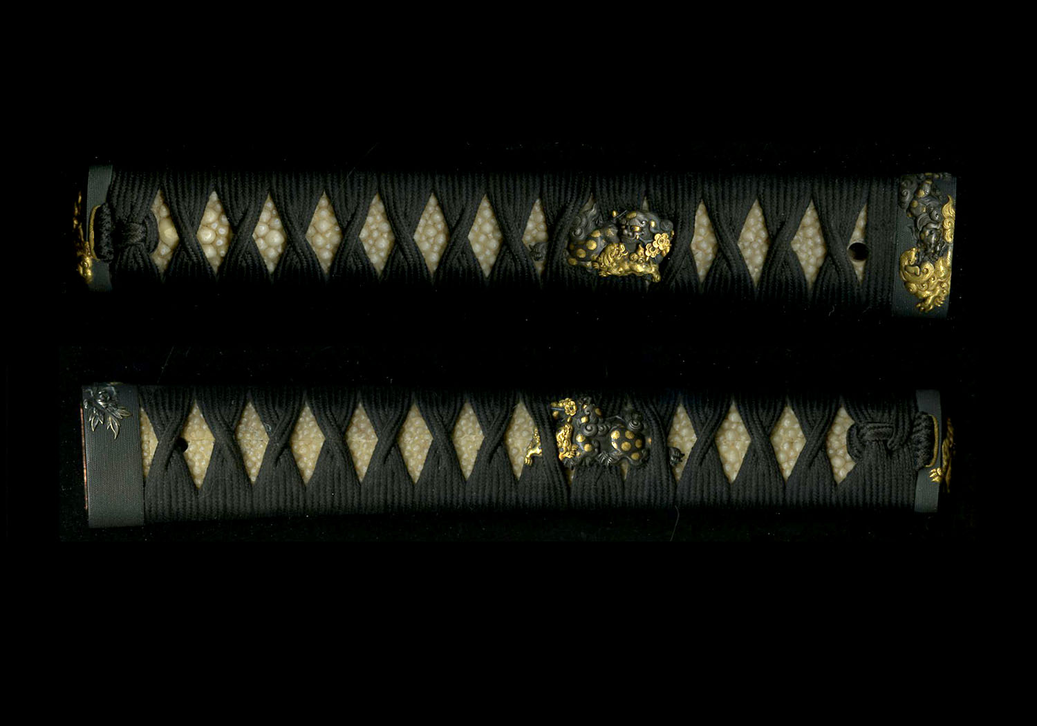 This blade comes with a fantastic koshirae.  The saya is black lacquer and is in pristine condition.  The fuchi, kashira, and menuki are signed Hidetomo (kao).  Hidetomo worked in the mid-1600’s and was a student of Omori Teruhide.  The quality is superb and consists of shishi lion-dogs done in extremely high relief in shakudo and gold.  The tsuba is of shibuichi and is delicately carved in kebori style depicting a shishi also.