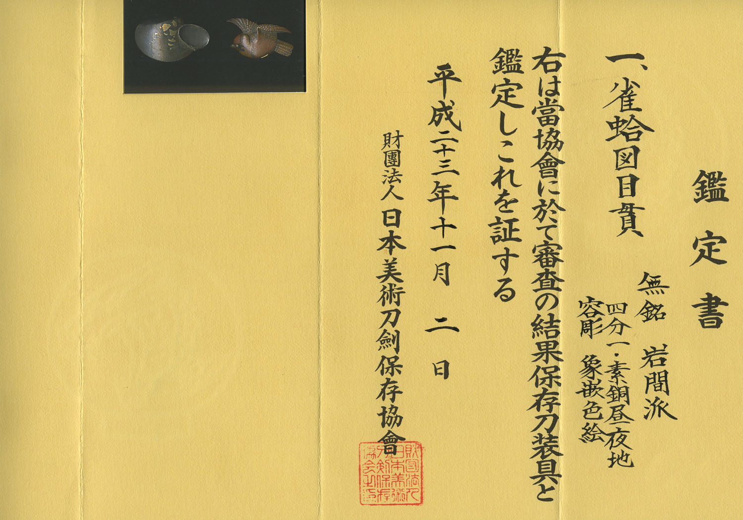 This is a very pleasing pair of menuki from the Iwami school. One of the menuki is a clam shell made of silver. The other is a beautiful sparrow made of copper. There is an old Chinese proverb that says that a sparrow may become a clam in the sea, and a field-rat may become a quail. The proverb means that even impossible things can happen in the mysterious world we live in. I think these menuki pay homage to that proverb. These menuki measure 1 1/8 inches or 2.9 cm by 9/16 inches or 1.9 cm. They are in excellent condition and come with NBTHK Hozon papers attesting to this attribution and their quality.
