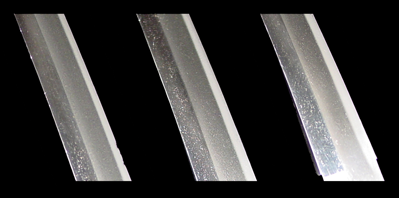 HAMON Kanehira made two distinct types of hamon. The first was made narrow and formed in nie-deki with a pattern of ko-chôji midare with ko-midare mixed together with much nie not unlike the hamon of Tomonari. Deep ashi, inazuma, and kinsuji are present. He also worked in nioi with nie clustered around the nioi.