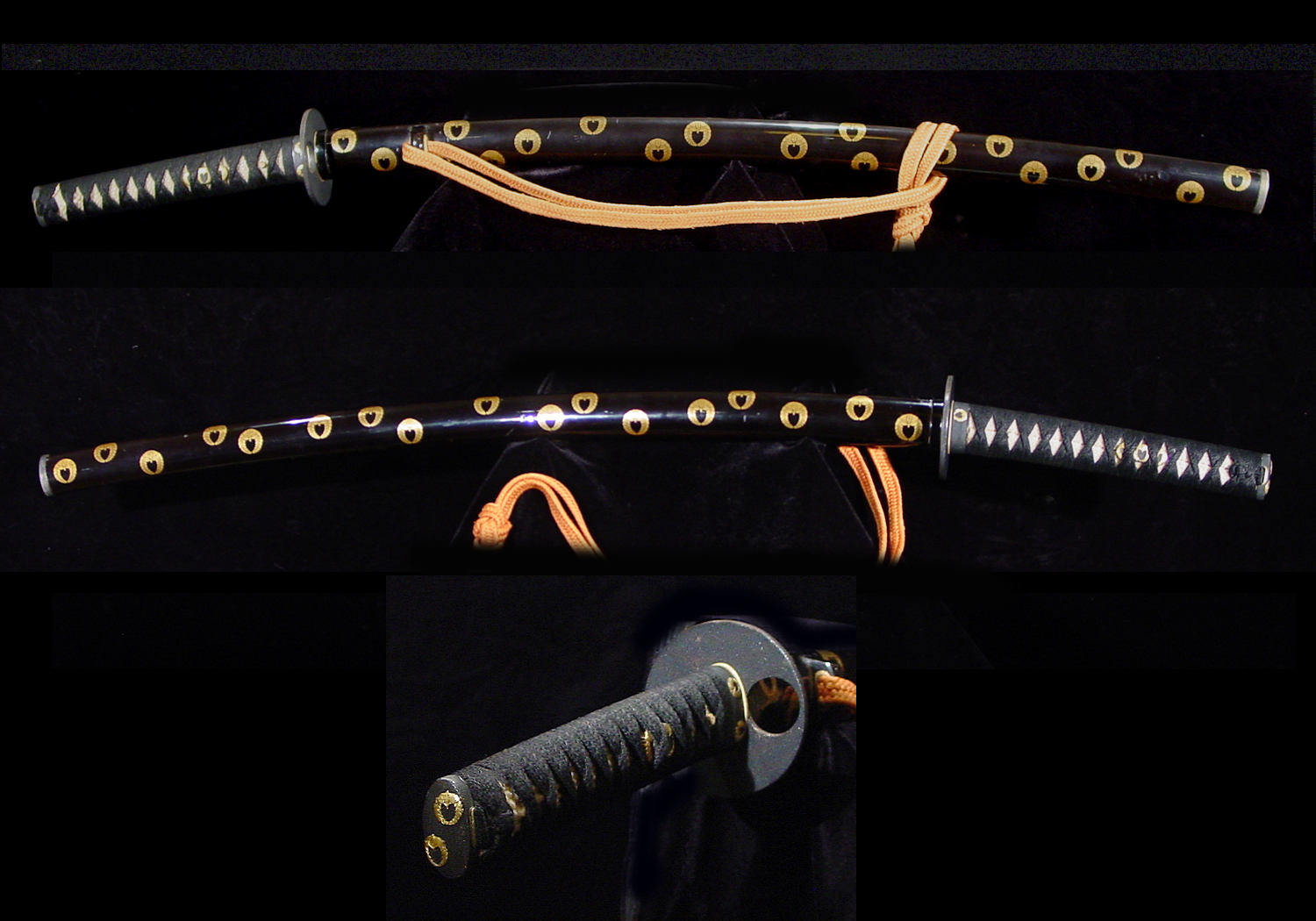 This blade comes with a lovely koshirae with extensive family crests (mon) of the family of its last Samurai owner in the 19th century. The saya is lacquered black and covered with the family mon done in gold lacquer. All of the kodogu comprising this koshirae are made of shakudo nanako. The tsuba is round with two large round openings. Both sides of the tsuba and the mimi (rim) are also shakudo nanako and the balance of the metal fittings are shakudo with heavy gold matching family mon. This blade obviously belonged to a high ranking Samurai of this clan.