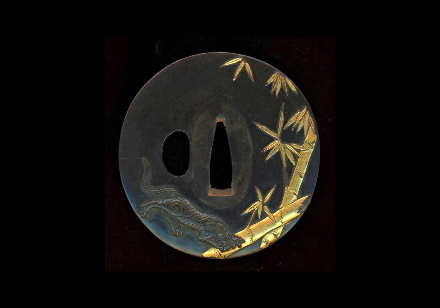 The kitae of the blade is typical konuka hada that presents itself beautifully as one would expect to find in a top quality Hizen blade. The hamon is a nie based shallow notare that flows up and down the blade like gentle sea swells. The habuchi is bright and clear and covered in profuse nie that continue down into the ha forming various patterns. There are bo-hi (large grooves) in the shinogi that run from the yokote to the mune-machi ending in a maru-dome (rounded end). The habaki is a wrapped in heavy gold foil giving it a feeling and appearance of solid gold.