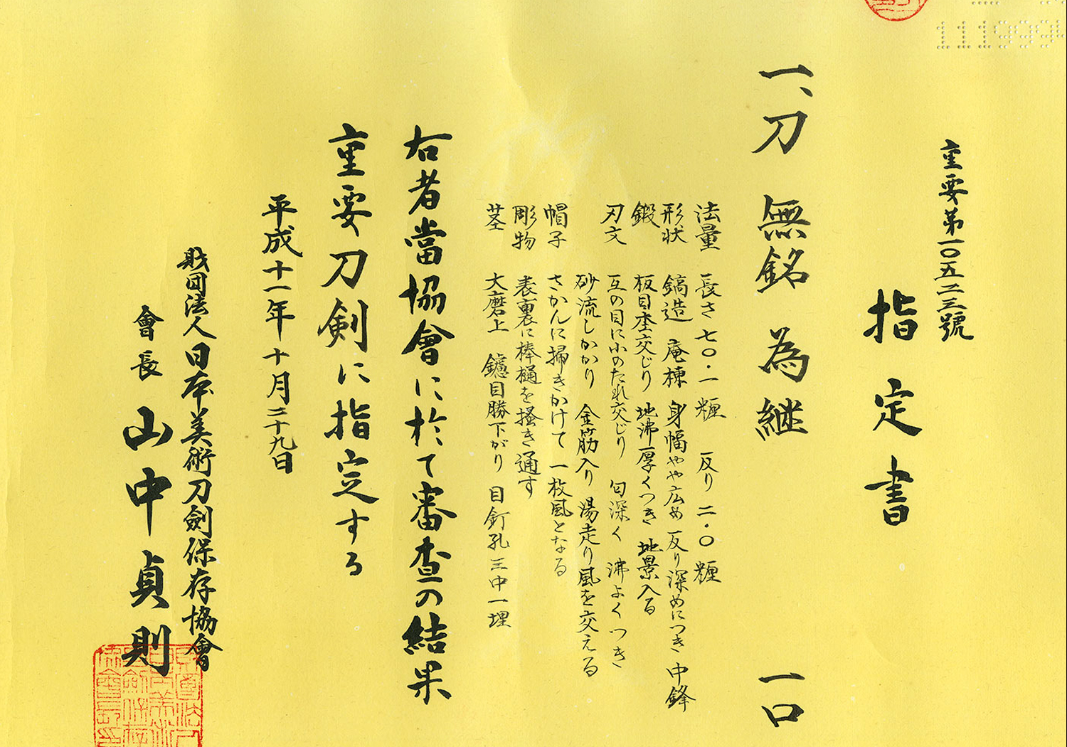 Jūyō-tōken at the 45th Jūyō shinsa from October 29, 1999