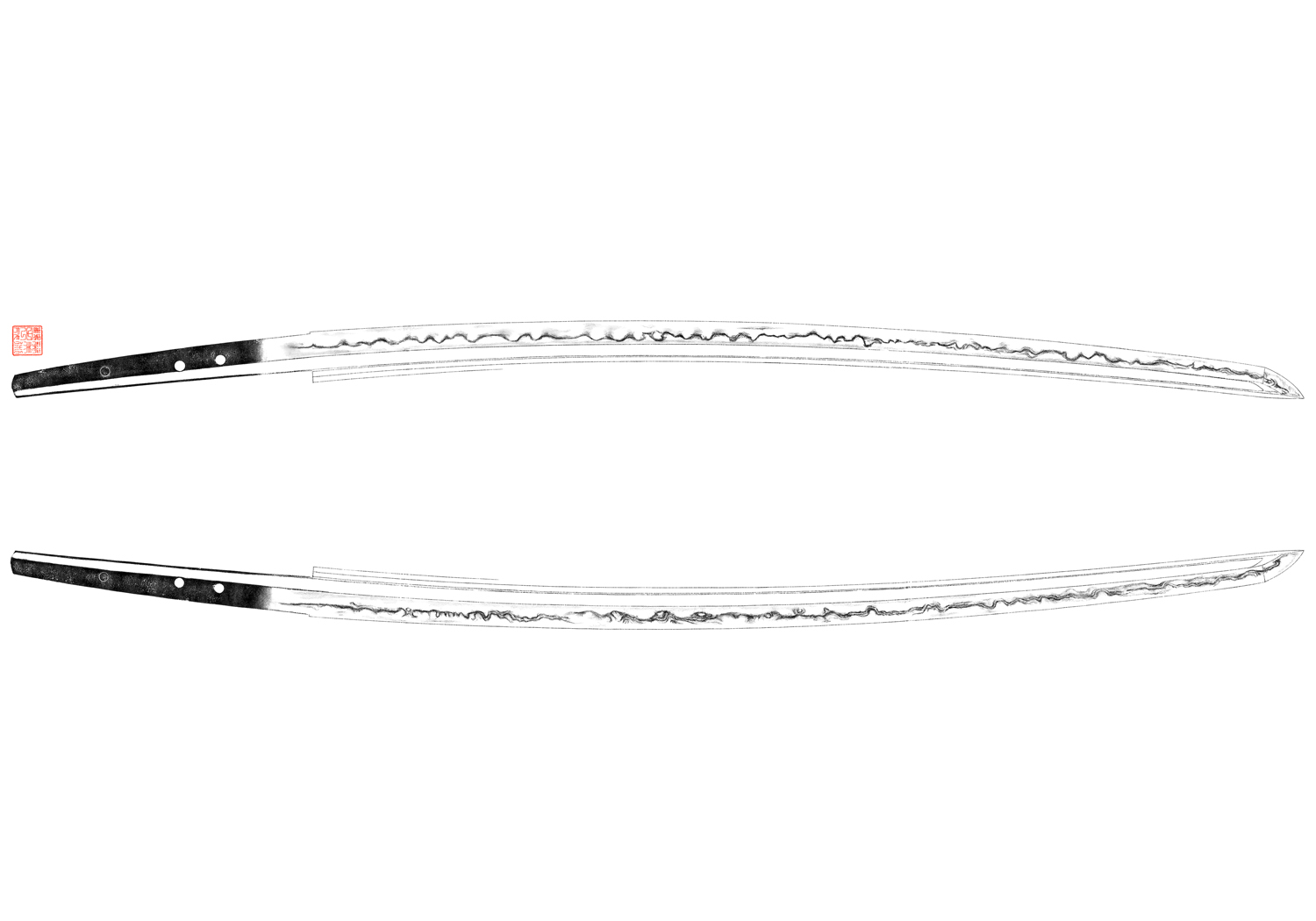 According to the prevailing view, Tametsugu (為継) was the son of Gō Yoshihiro (郷義弘) and a student of Norishige (則重), although from the point of view of active periods of all of these smiths, this approach may be revised. There exist oshigata of blades by Tametsugu which are dated Enbun two(延⽂,1357) and Ōan two(応安,1369) and which are signed “Echizen no Kuni Fujiwara Tametsugu”(越前国藤原為継),“Fujiwara Tametsugu from Echizen province.” Apart fromthat, a blade exists which is dated Ōan seven (1374), which is signed “Nōshū-jū Fujiwara Tametsugu”(濃州住藤原為継),“Fujiwara Tametsugu, resident of Mino province.” Thus, we learn that the smith had moved between Ōan two and Ōanseven from Echizen to Mino province. This blade shows a kitae in itame that is mixed with mokume and that features chikei and plenty of ji- nie. The hamon is a nie-laden gunome with a wide nioiguchi that is mixed with ko-notare, manysunagashi, and kinsuji, and the bōshi features much hakikake. Thus, the deki of this blade is quite ambitious and itsinterpretation attributes it to Tametsugu. We have here a masterwork among all blades by this smith.