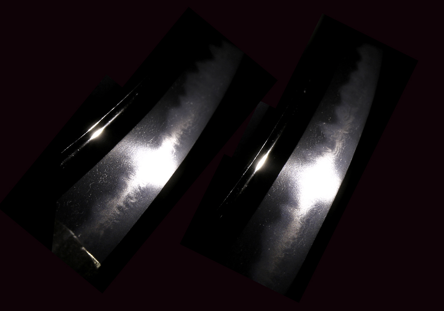 The sugata of this sword is very typical of the later part of the Nanbokucho era. It differs slightly from the works of Yoshihiro (義弘) and Norishige (則重) by its wider mihaba, elongated kissaki, thin kasane, and lack of any narrowing from the moto-haba to the kissaki-haba. The flowing itame hada with areas of mokume hada and even a few areas of o-mokume hada and the presence of a few areas of a “blackish” darker steel point to a combination of Mino(美濃) traits mixed with the steel of the Northern region of Etchu/Echizen (越前/(越中). Throw in the jigane that is covered in ji-nie;a hamon that is gunome-midare with a slight mixing in of ko-notare; ashi and yô activity here and there; streaks of sunagashi; a habuchi that is well covered in nie and you have a strong Sôshû (相州) influence, much like the works of Norishige (則重).