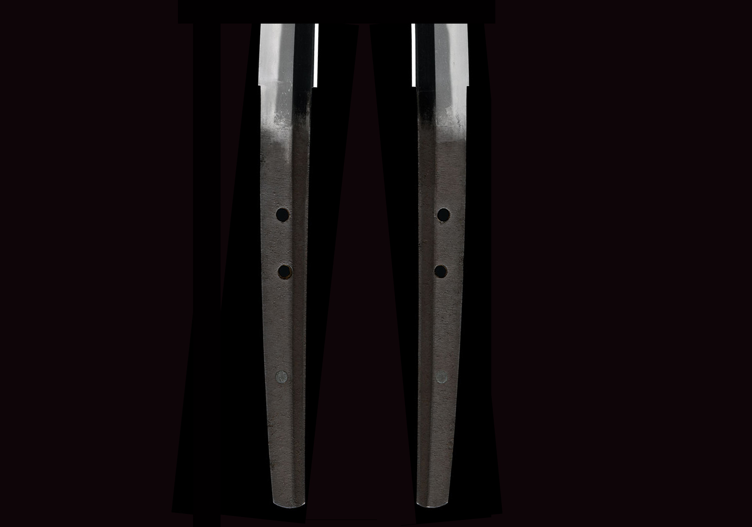 Nakago: ō-suriage, kurijiri, katte-sagari yasurime, three mekugi-ana (of which one is plugged), mumei