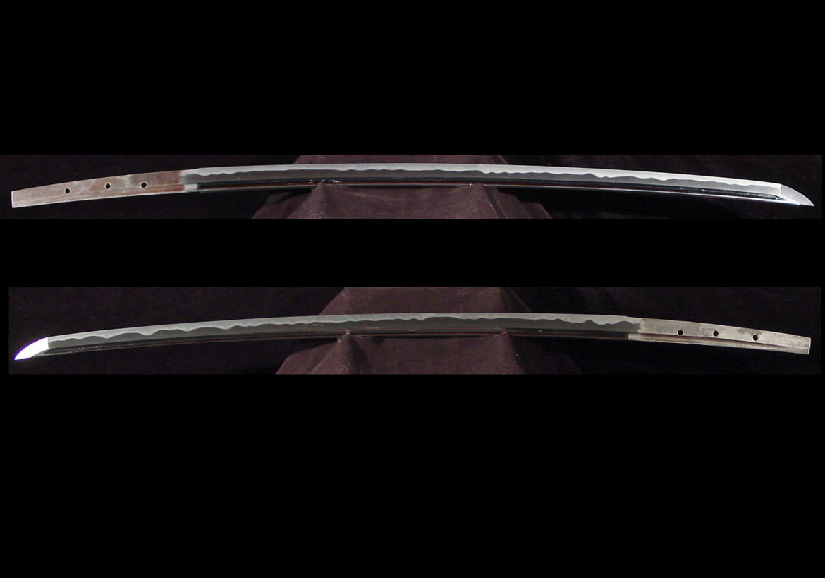 Characteristics: The construction is shinogi-zukuri with an iori-mune. The blade is somewhat wide, and the thickness is average. The curvature is shallow and the medium-sized kissaki is somewhat long. The kitae is itame mixed with mokume that has a prominent hada feeling. The jigane is covered in ji-nie with a mixing in of jifu, and the midare-utsuri is prominent. The hamon is a mixture of various type of hamon such as gunome, ko-gunome, togari-ba and ko-chôji. There is ko-ashi and yô activity. Although the habuchi is nioi based, it is covered in ko-nie, and there are streaks of sunagashi. There is also kinsuji activity and small tobiyaki. The bôshi is midare-komi with a ko-maru tip and somewhat long kaeri. There are bôhi carvings on both sides of the blade that taper off onto the nakago. The nakago is ô-suriage, and the nakago-jiri is kiri. The yasurime are katte-sagari, there are three mekugi-ana, and the blade is unsigned.