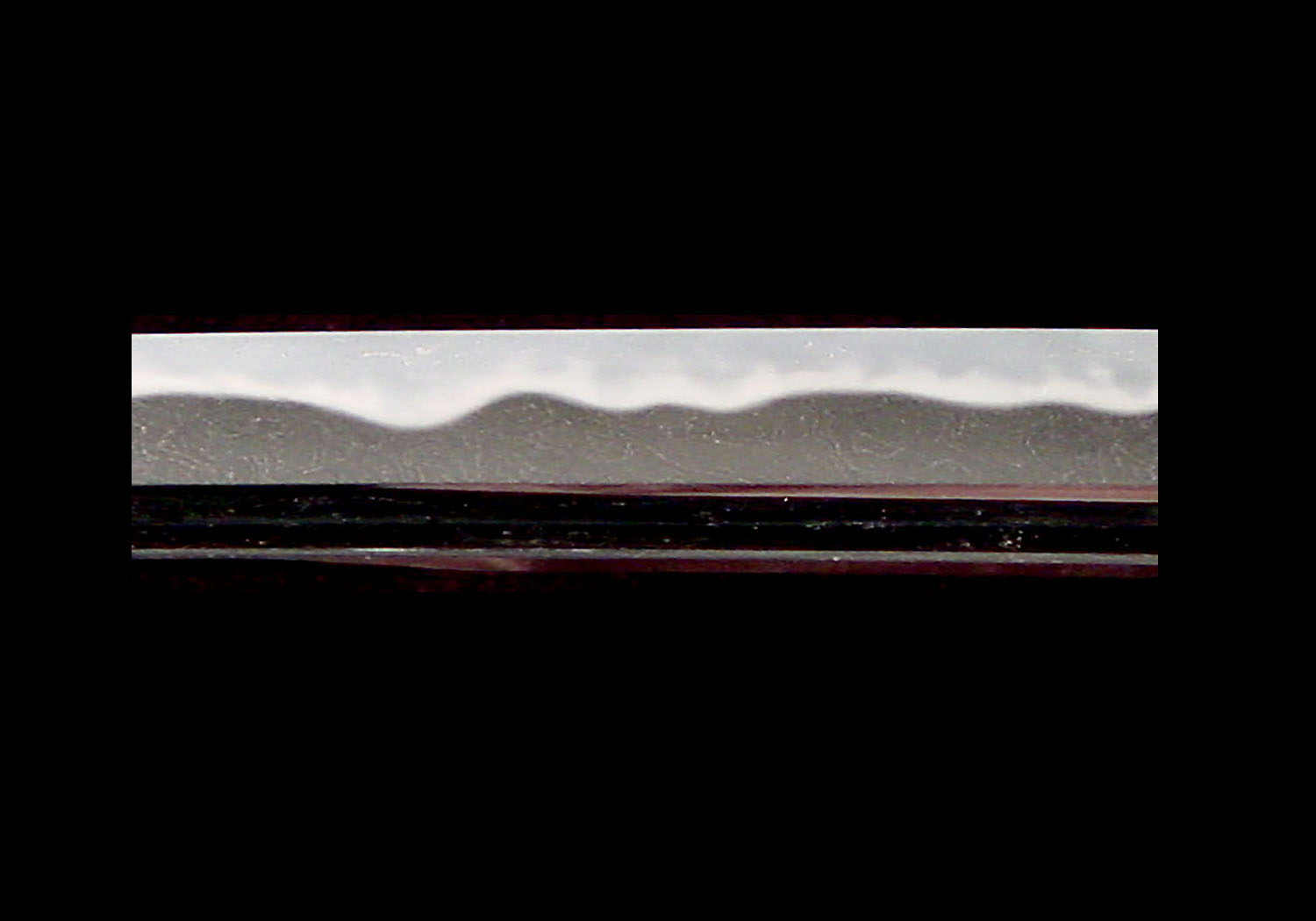 As for this sword, the kitae is itame mixed with mokume and a mixing in of jifu, and the midare-utsuri is prominent. The hamon is a mixture of various types of hamon such as gunome, ko-gunome, togari-ba and ko-chôji. The yaki-ba can be seen as a midare-ba with variations, and as noted previously, these features display the characteristics in Morikage’s style of workmanship. Among similar swords, the workmanship is excellent, and both the ji and ha have no weak features, making this a very healthy blade.