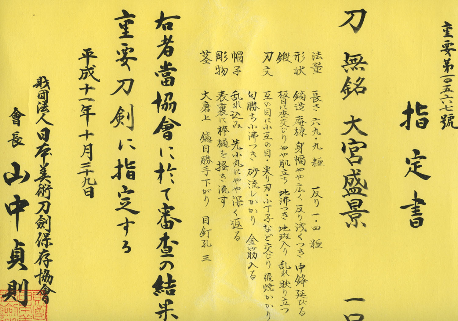 Designated Jûyô Tôken at the 45th Shinsa of 29 October, the 11th year of Heisei (1999)