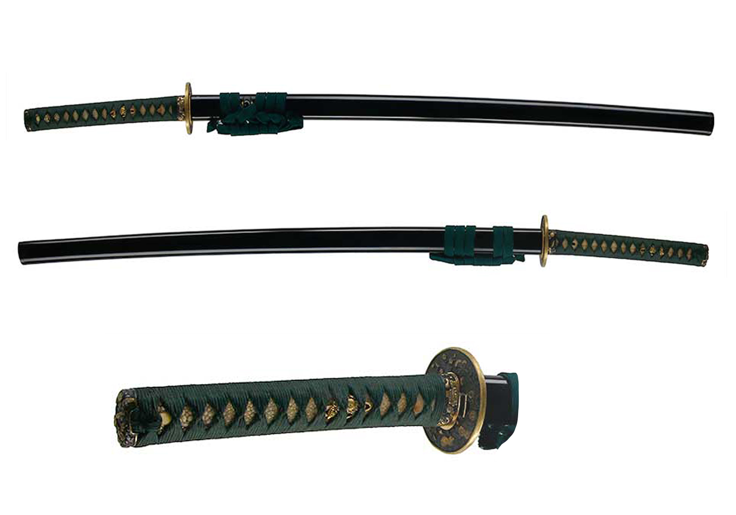 The katana is signed Dewa Daijô Fujiwara Kunimichi and it has a nagasa (length) of 69.7 cm or 27.04 inches. The sori (curvature) measures 1.2 cm or 0.47 inches. The width at the hamachi: 2.98 cm or 1.17 inches and the width at the kissaki: 1.91 cm or 0.75 inches. The kasane (thickness) of the blade is 0.65 cm or 0.25 inches.
