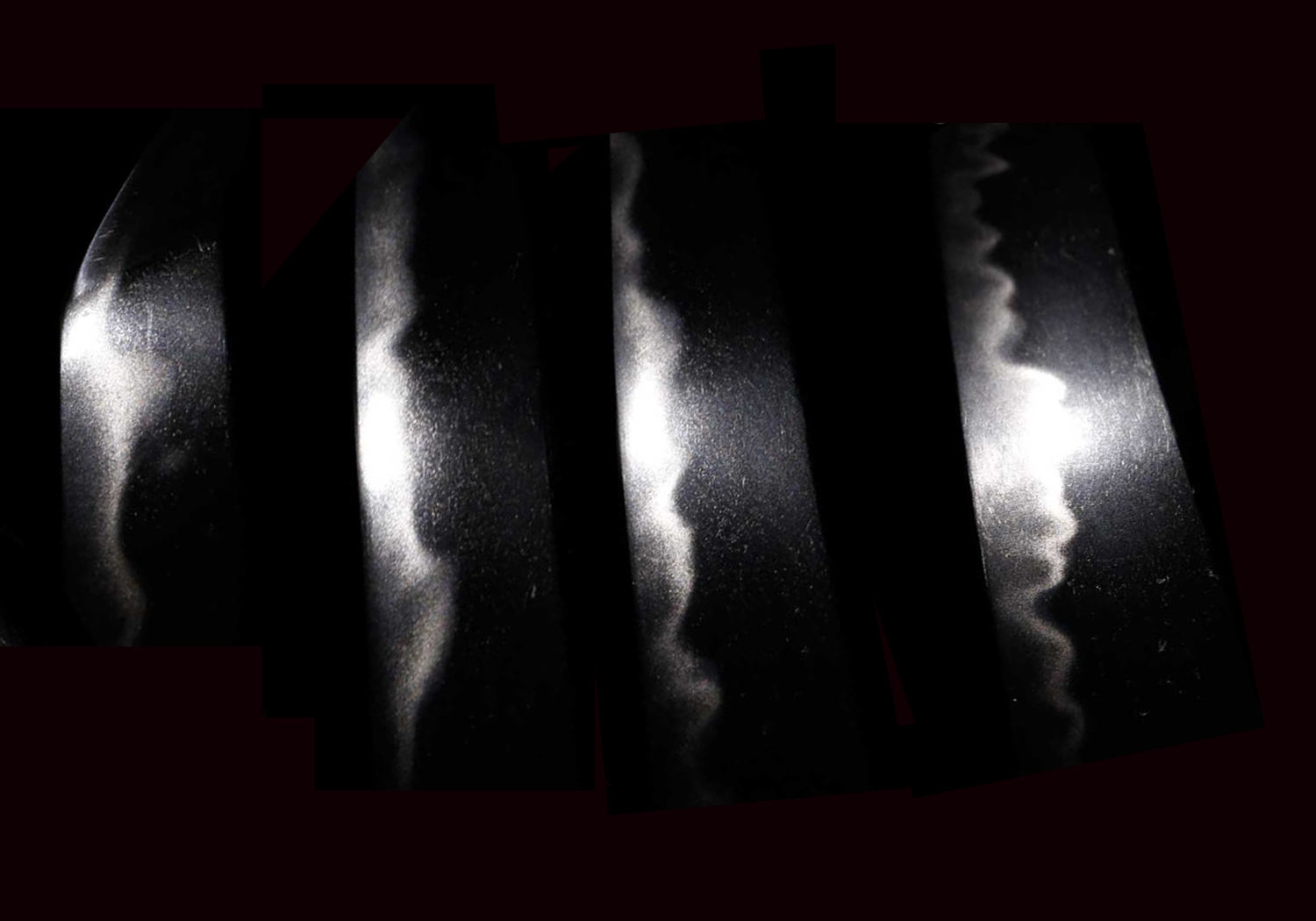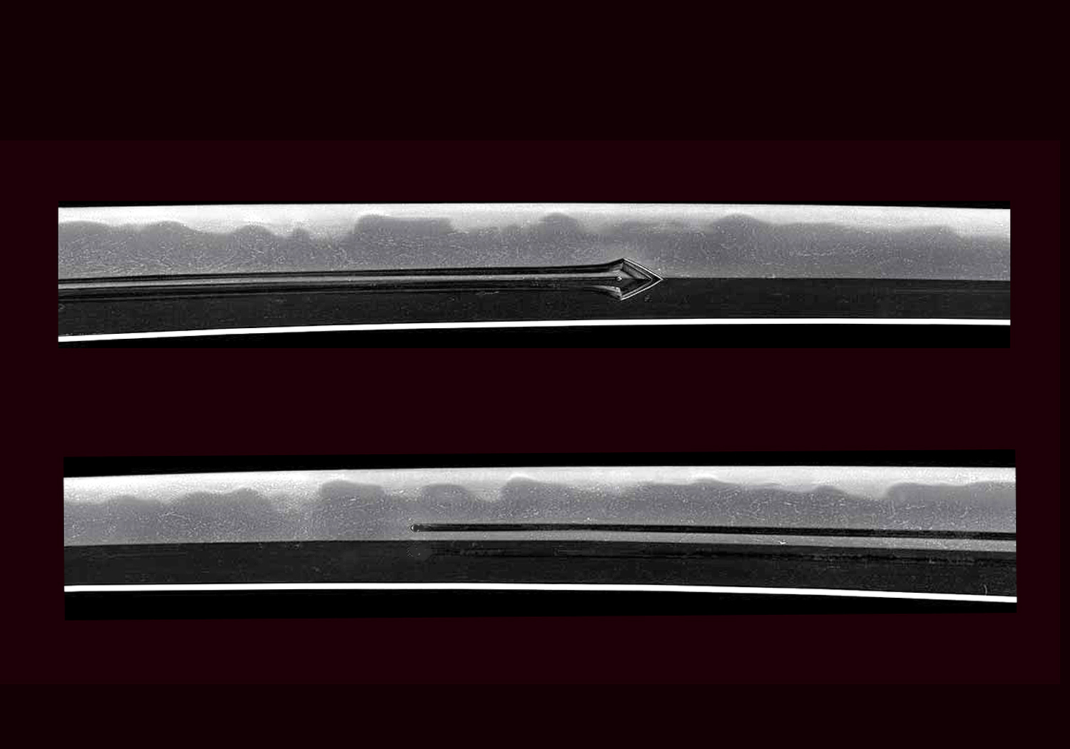 The hamon (temper line) is done in nie deki and consists of gunome-midare and ko-gunome midare. In the ha (tempered edge), there is sunagashi and kinsuji. The bôshi is rounded in what we call a Mishina bôshi. There is only one mekugi ana (hole) and the blade is not shortened.
