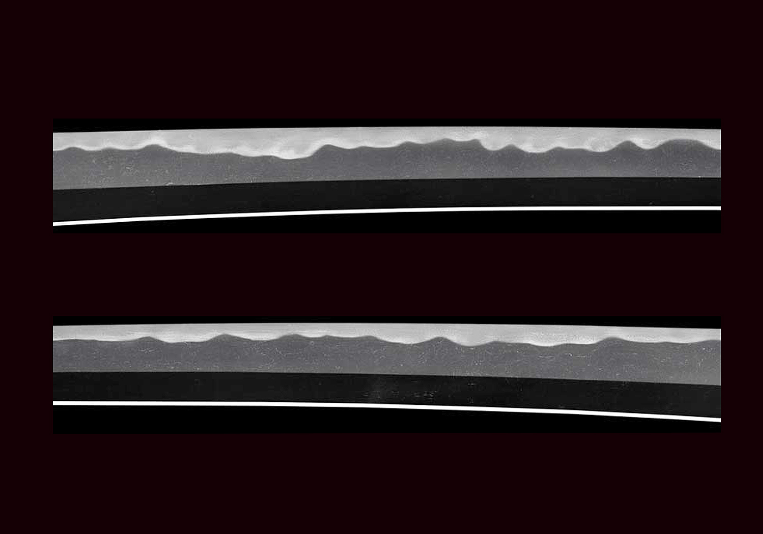 Kunimichi’s works are unique in containing both quiet and somewhat unclear areas as well as outstanding areas admirably sprinkled with nie grains. This creates a rather inconsistent style of tempering and is an unmistakable trait of Kunimichi.