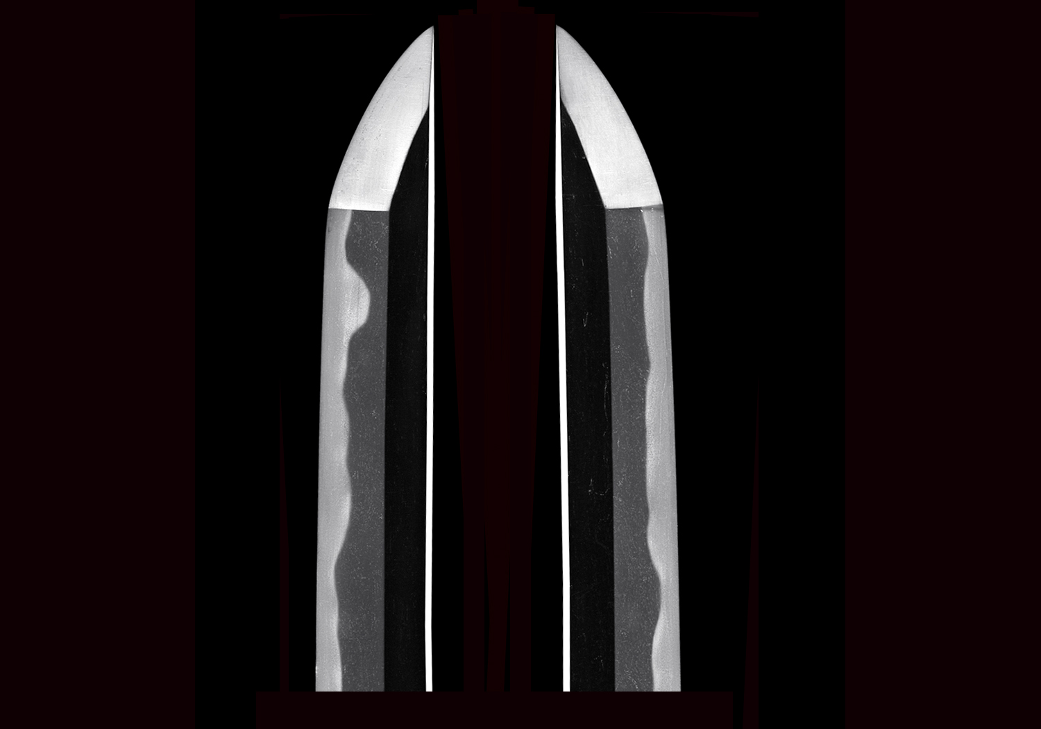 Kunimichi’s workmanship displays the widest range of variations of all of Kunihiro’s students. It shows a great deal of influence derived from the Mino tradition. This is especially so with the hamon in the bôshi, it shows the Mino characteristics of notare and the tip in togari-gokoro followed by kaeri. These characteristics are common in the works of the swordsmiths coming out of the Mishina school. This bôshi is known as the san-pin or Mishina (三品) bôshi.