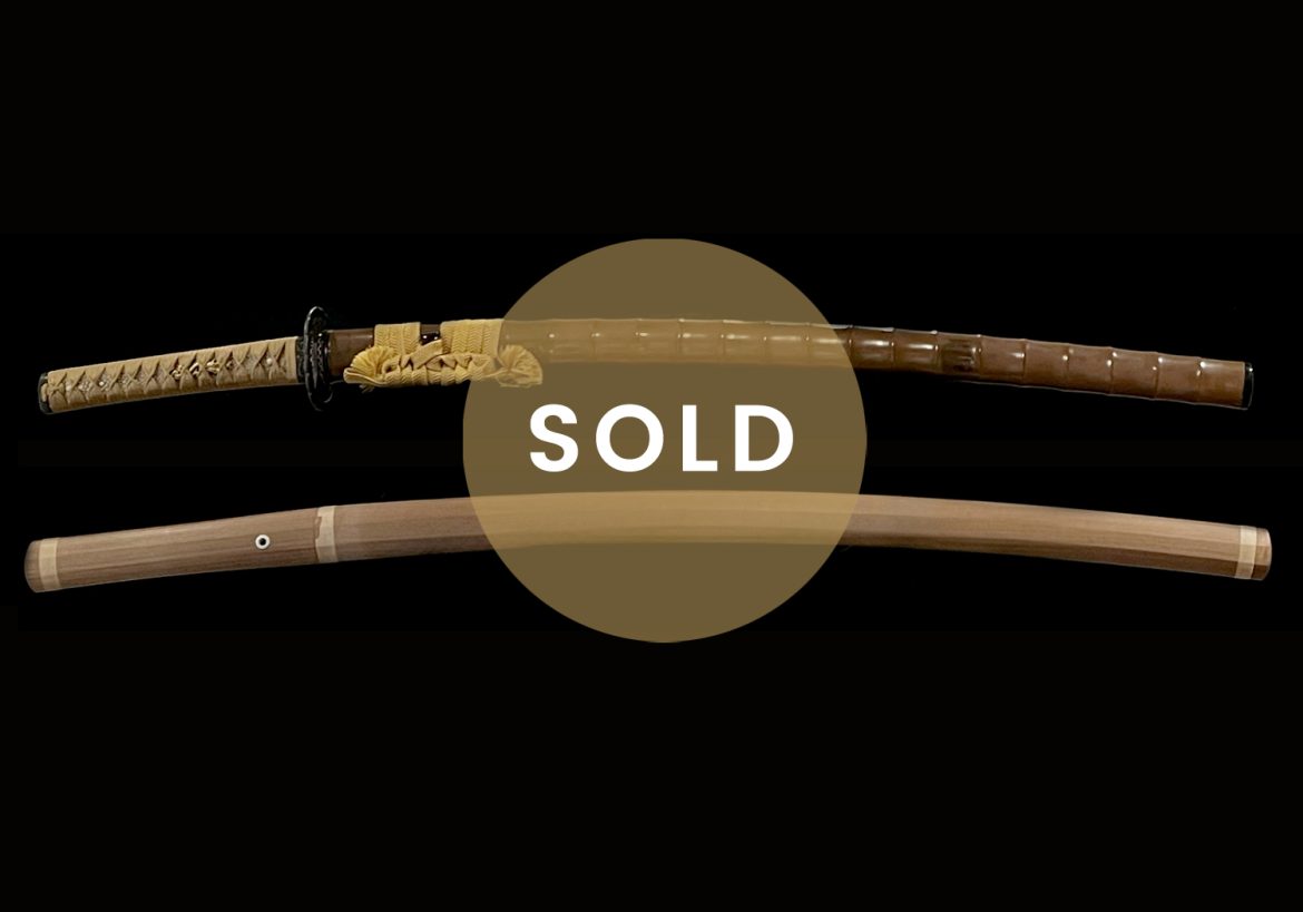 Accompanying this blade is a very attractive set of mountings (koshirae). The saya (scabbard) has been lacquered brown and carved into the shape of bamboo. The fuchi and kashira on the handle are made of shakudo and carved beautifully and deeply into many horses frolicking about. The menuki are of gold (possibly plated) carved in the form of two large dragons, one on each side. The tsuba is made of iron that has been carved into an intricate basket type design. It is signed Umetada. It tsuba comes with a Hozon Tosogu certification from the NBTHK verifying the signature to the Umetada school.