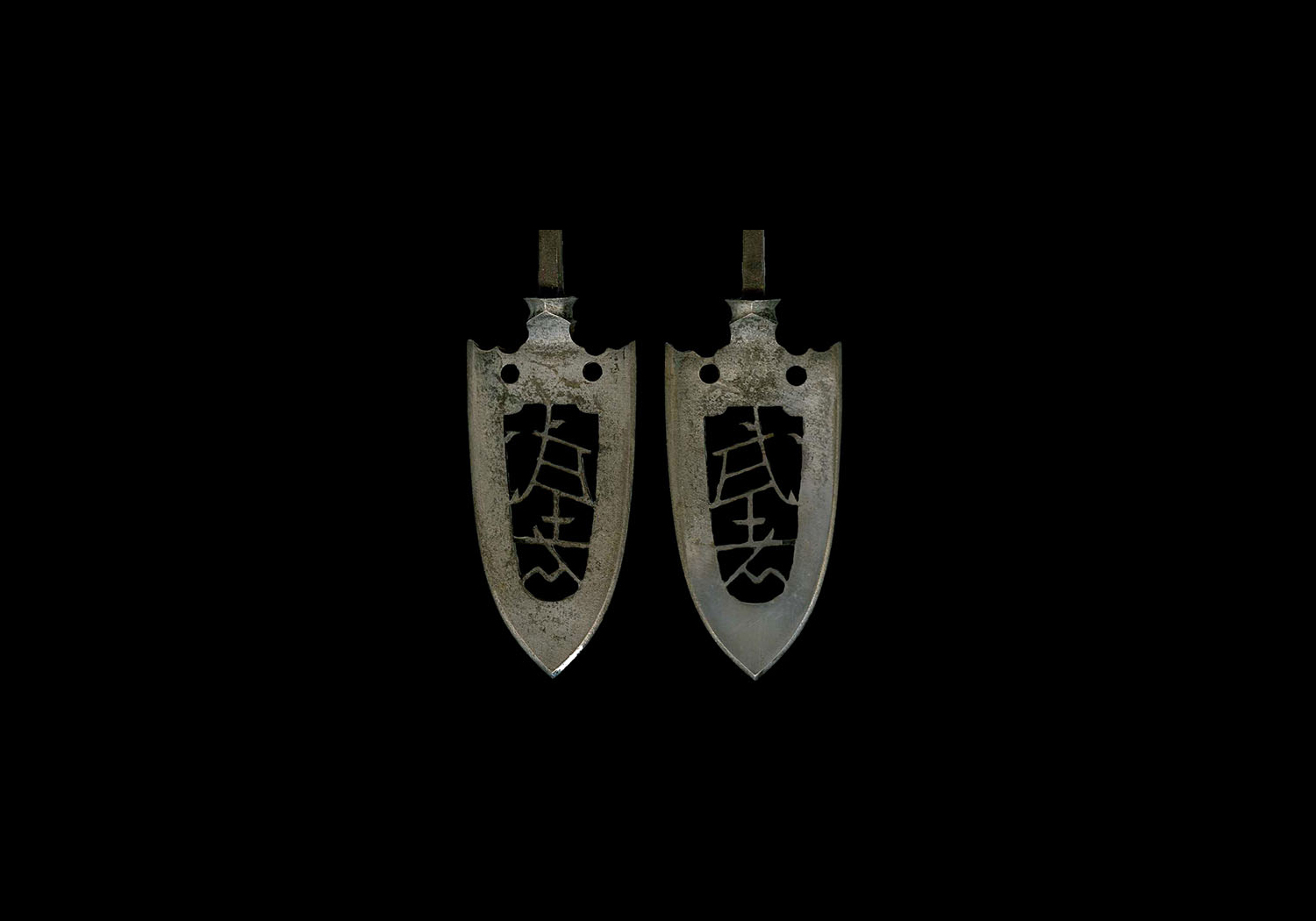 This type of flat blade Yanagi-ba yanone (willow leaf shape) is a difficult to find. What makes this rare is that instead of the typical cherry blossom open work, this one has a sukashi kanji character created when all of the metal but the kanji has been removed. This type of work is meant to be viewed with the tip down .